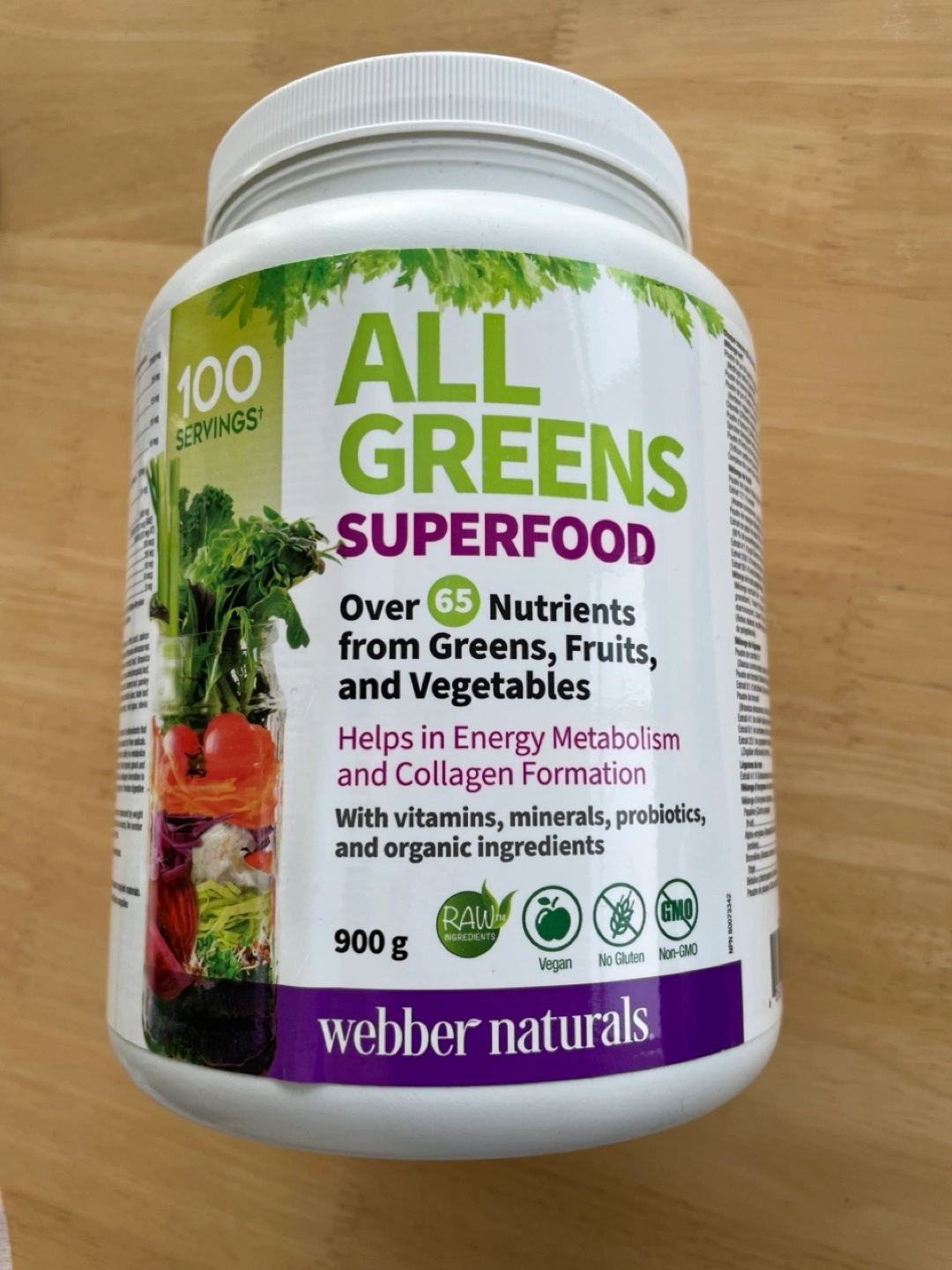 Webber Naturals All Greens Superfood. This contains over 65 nutrients from greens, fruits, and vegetables, helping in energy metabolism and collagen formation.