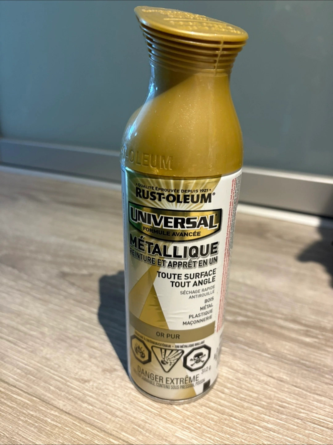FREE can of Rust-Oleum Universal Metallic spray paint in gold (Or Pur). It's a paint and primer in one, suitable for all surfaces like wood, metal, plastic, and masonry. Great for quick drying and provides a fine metallic brilliant finish. Only 10-15% has been used. #freecycle
