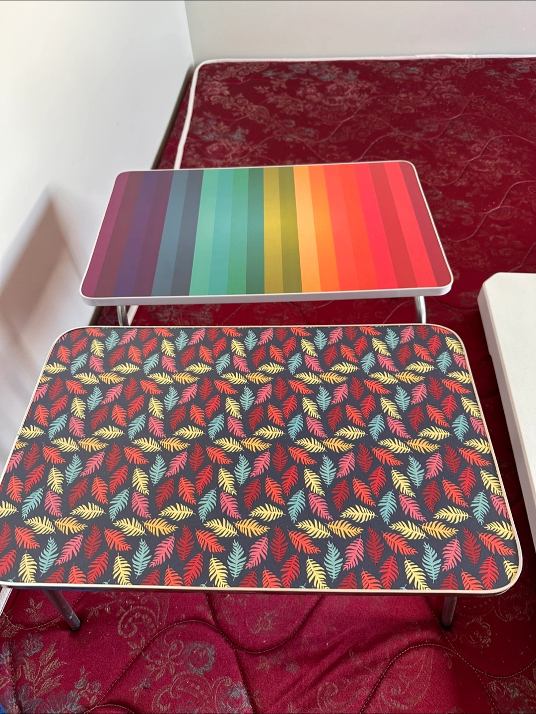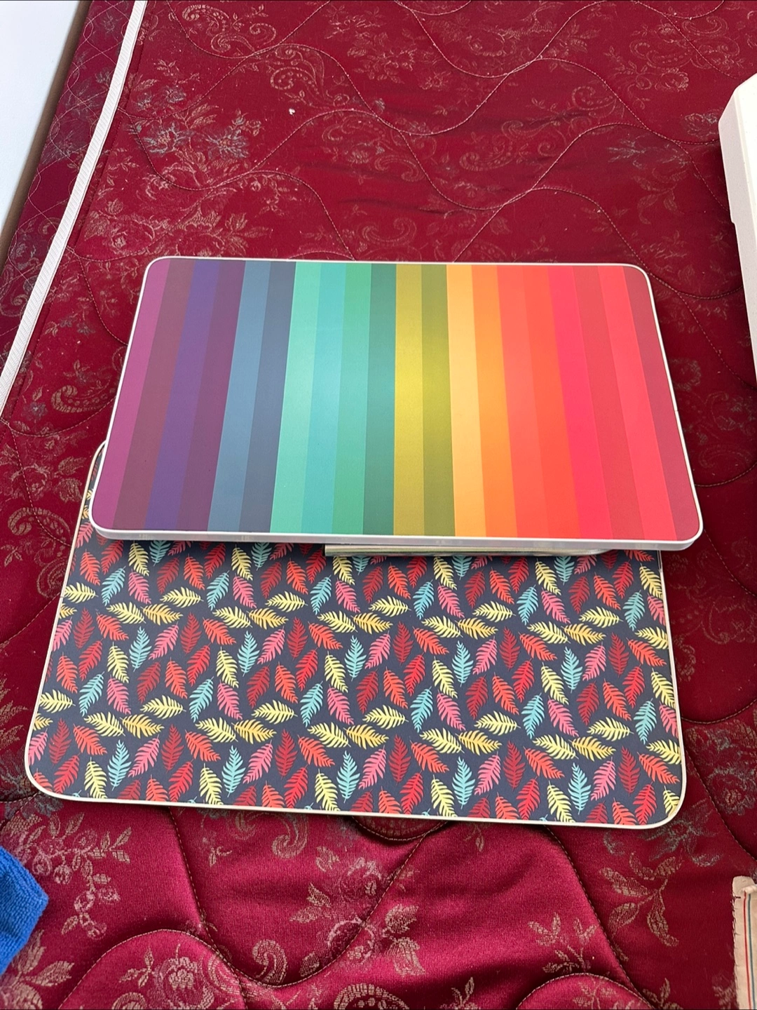 Selling a set of two folding lap desks! One has a colourful rainbow design and the other a leaf pattern.