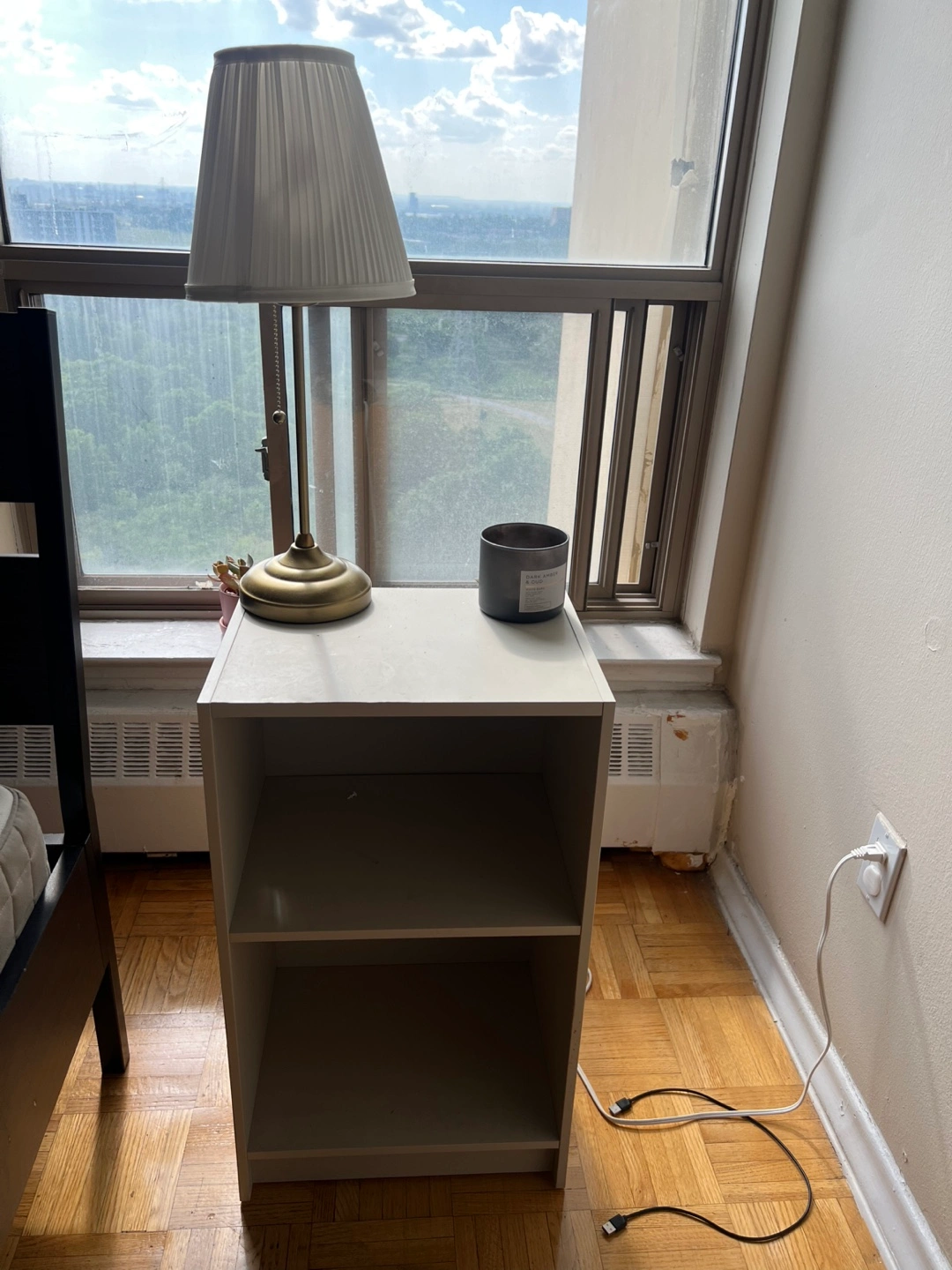 Selling two simple and functional white nightstands with two shelves. It's perfect for keeping your bedside essentials organized and within reach. Great for small spaces!