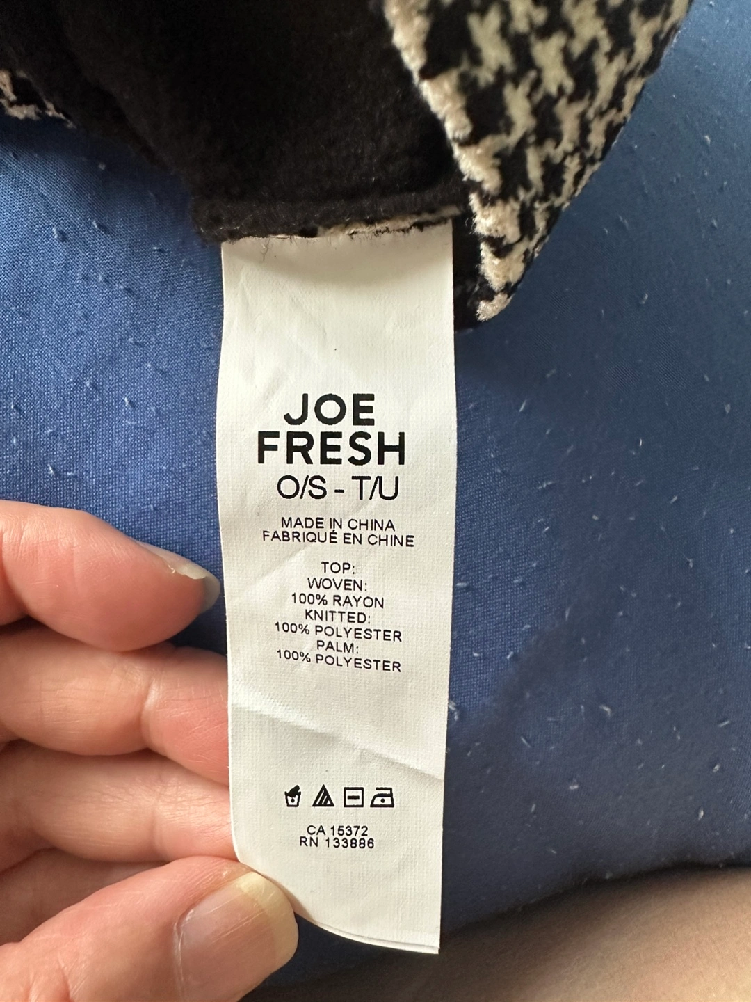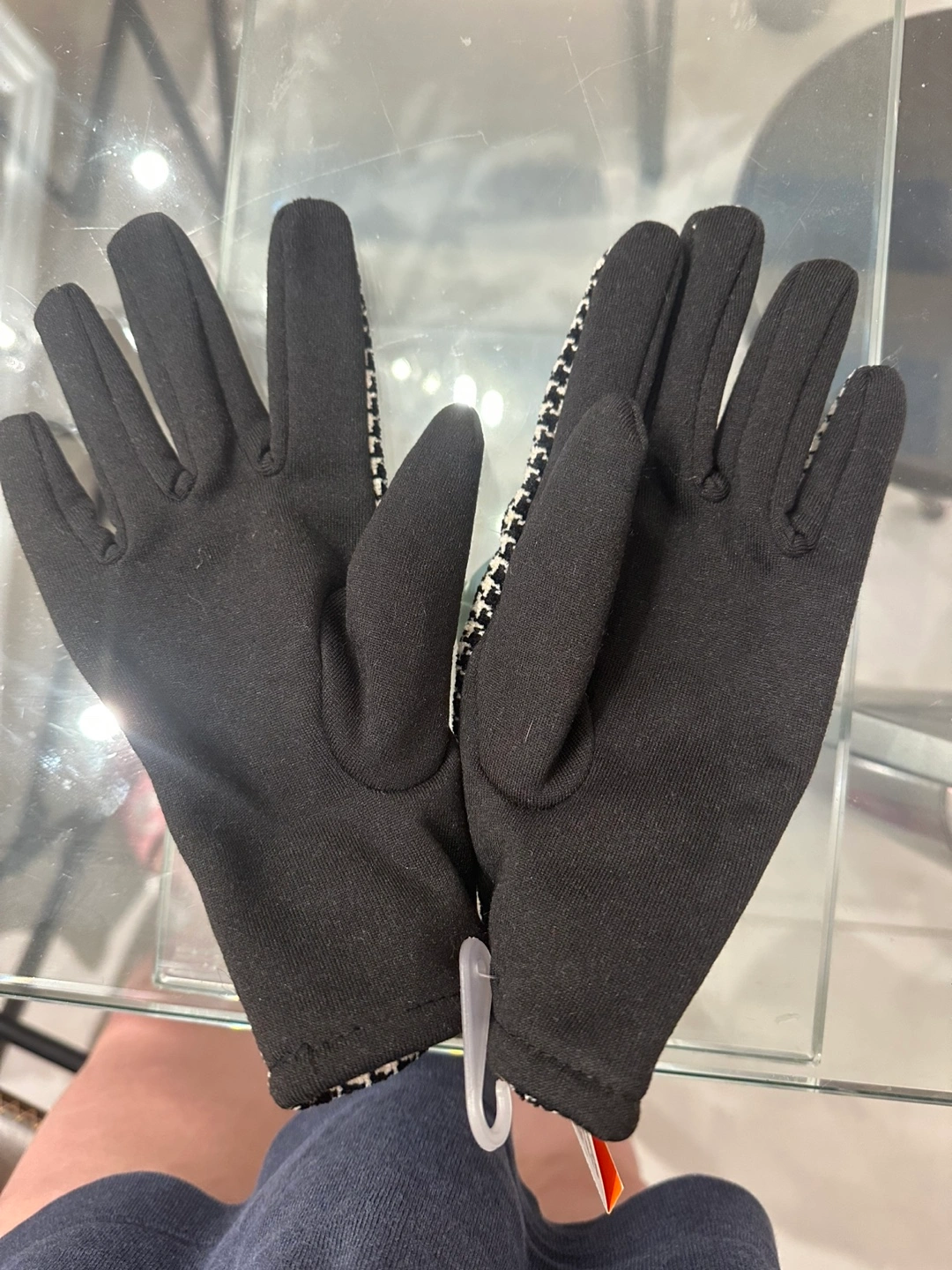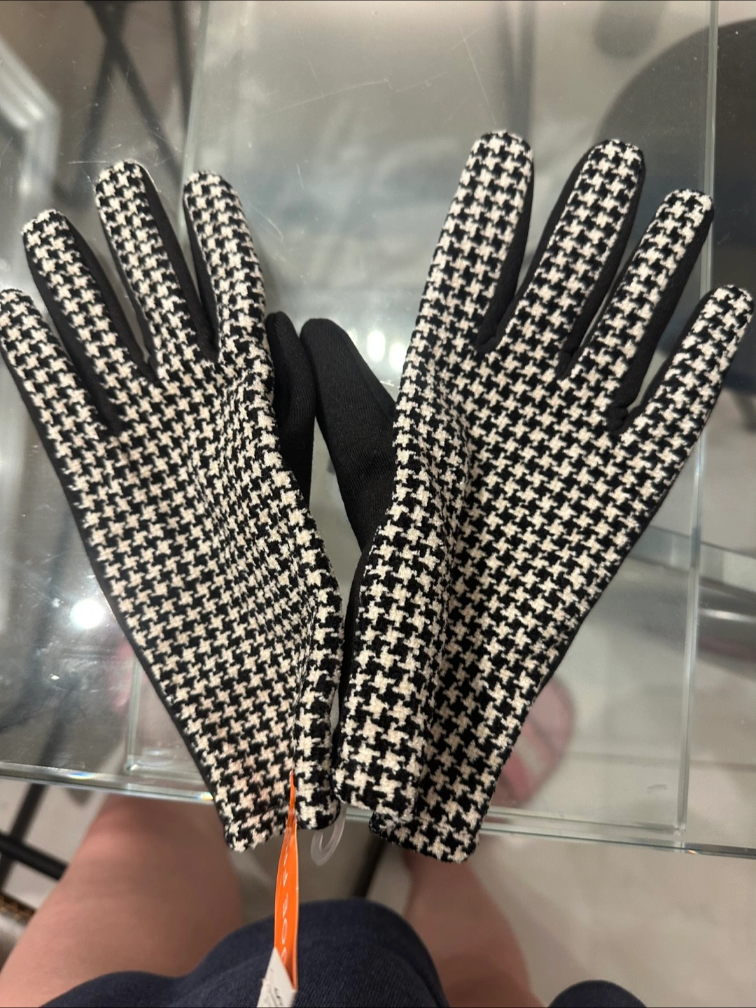 Selling a pair of Joe Fresh gloves in O/S size. They are black with a black and white houndstooth pattern on the back of the hand. The top is woven with 100% rayon, and the knitted part is 100% polyester. The palm is also 100% polyester. New with tag.
