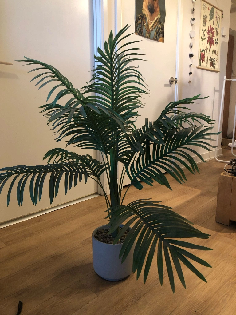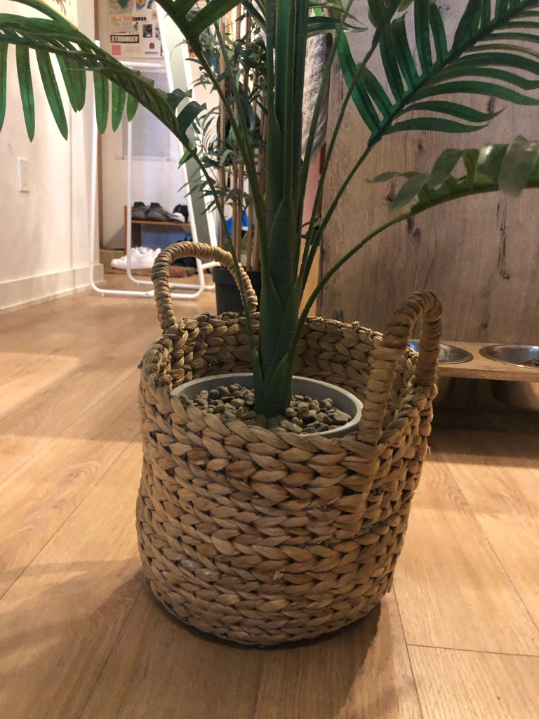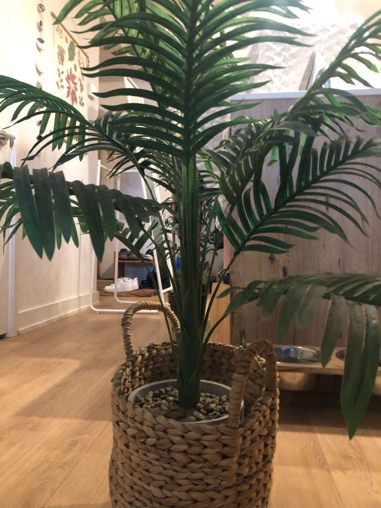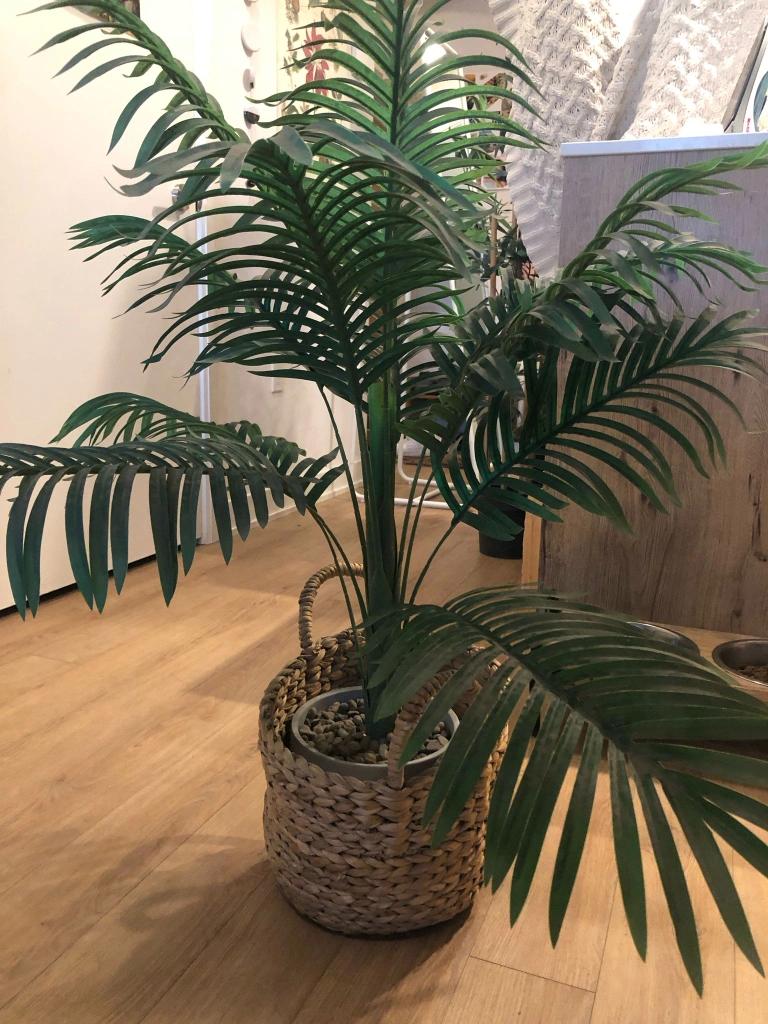 Selling a lovely faux palm tree that adds a touch of greenery to any room. It comes in a charming woven basket, perfect for a cozy, natural look.