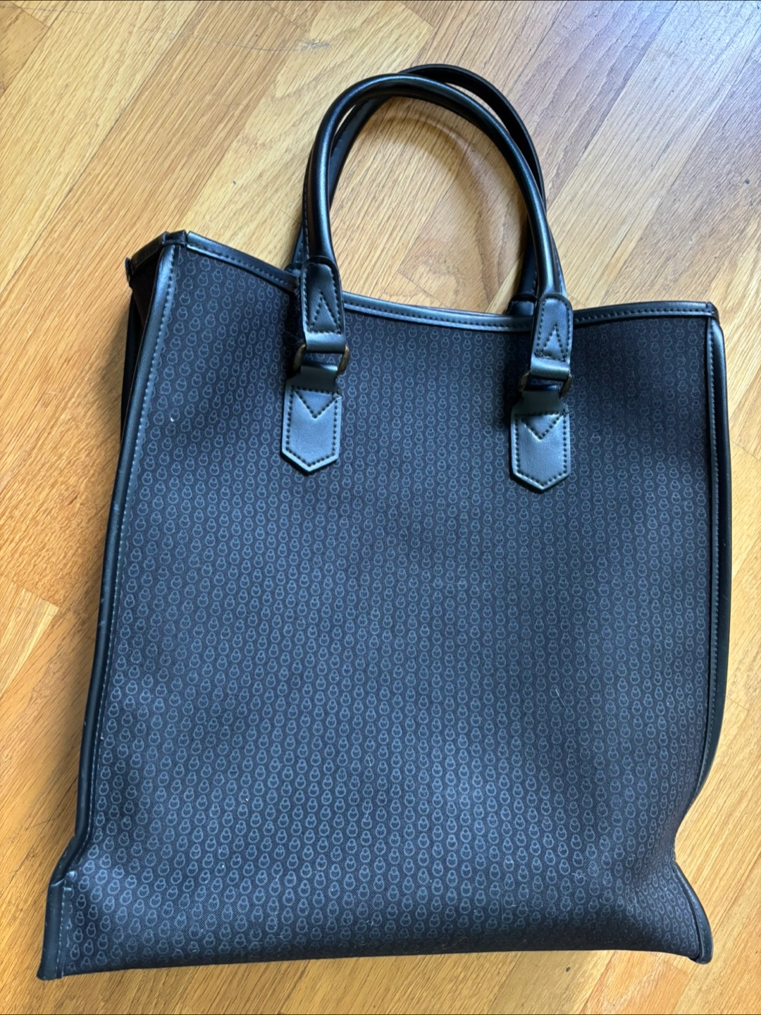 This is a large tote bag in black. Made in Taiwan. It's in used but fairly good condition and ready for a new home!