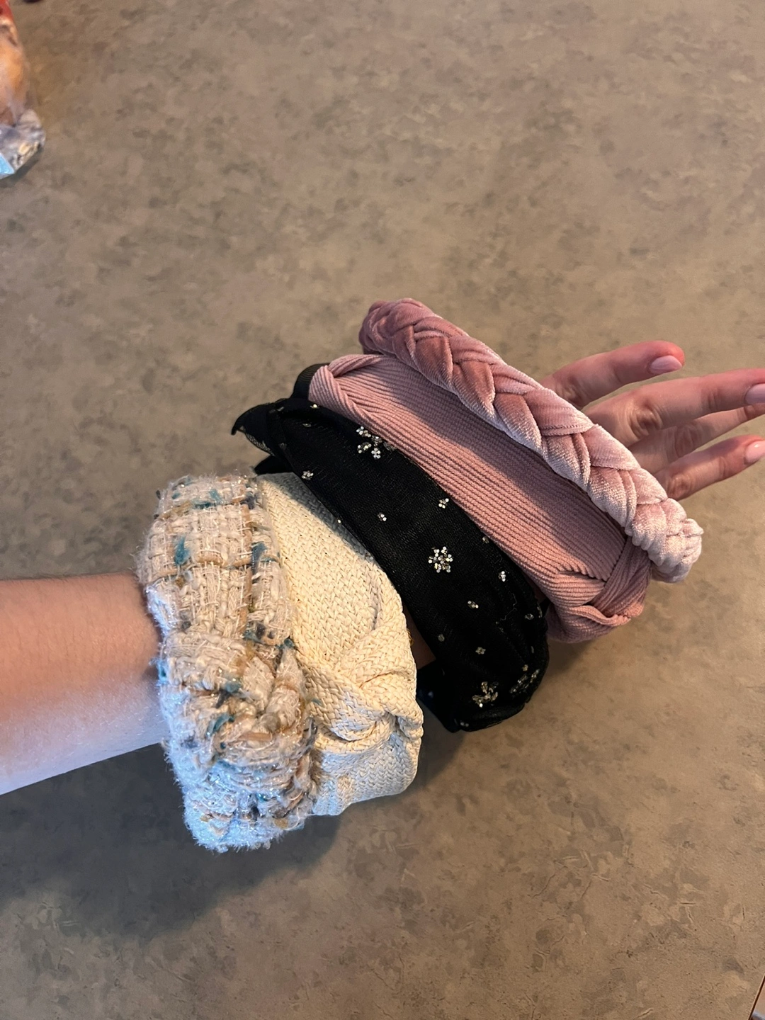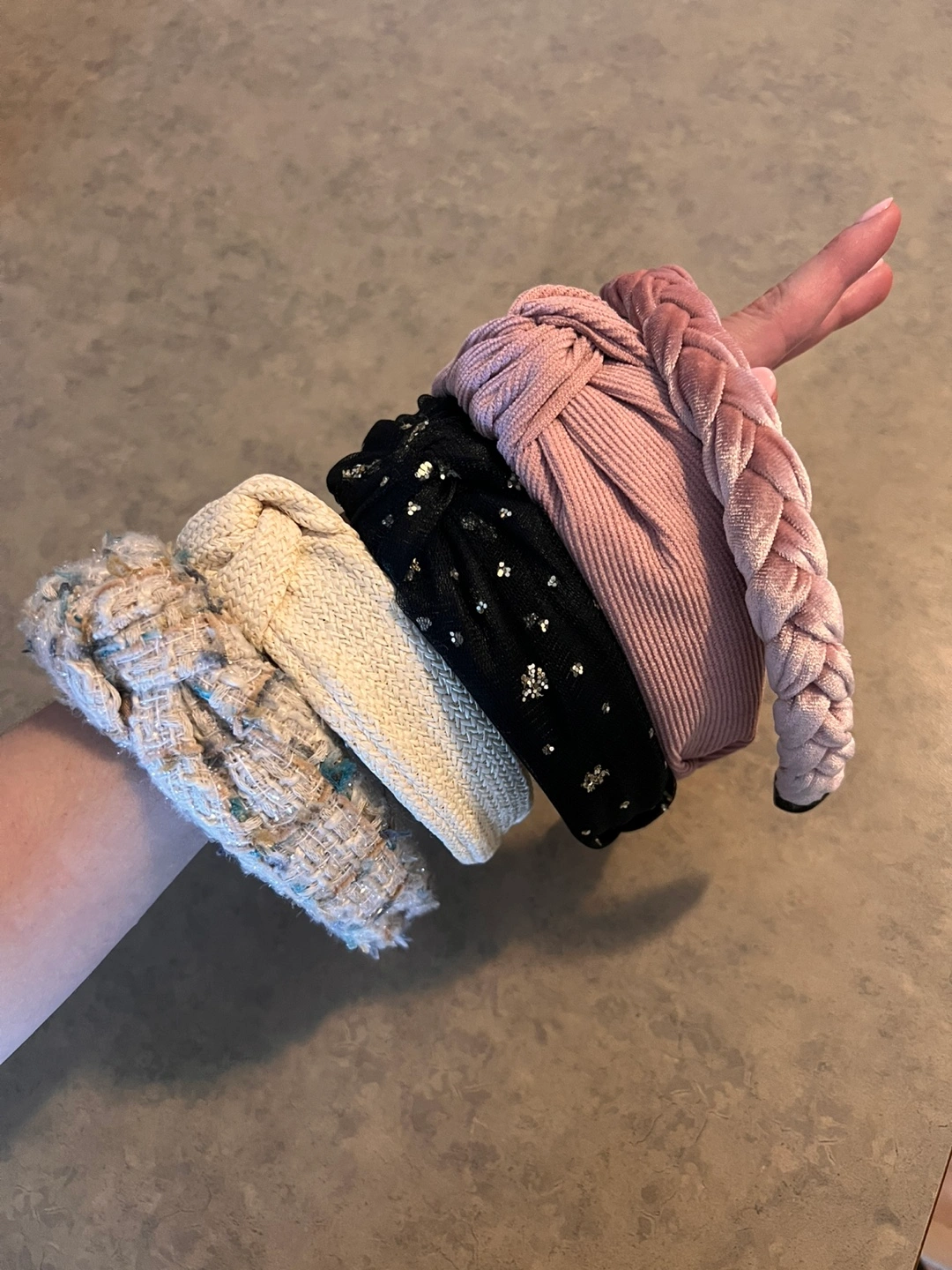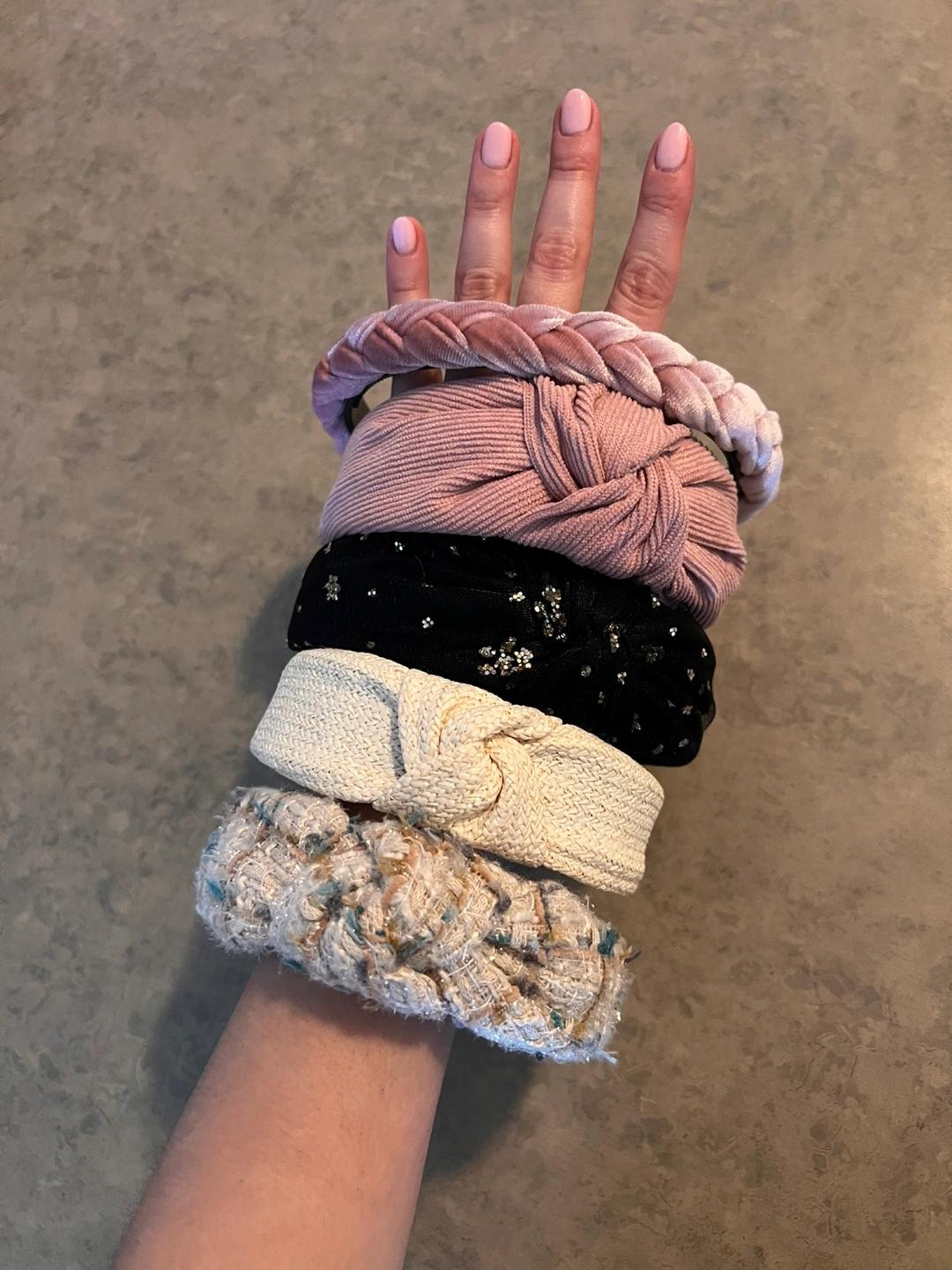 680Selling a set of five stylish headbands! You'll get a pink braided headband, a pink knotted headband, a black headband with gold stars, a cream knotted headband, and a tweed headband. They're in great condition and ready to accessorize your outfits