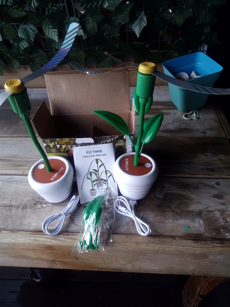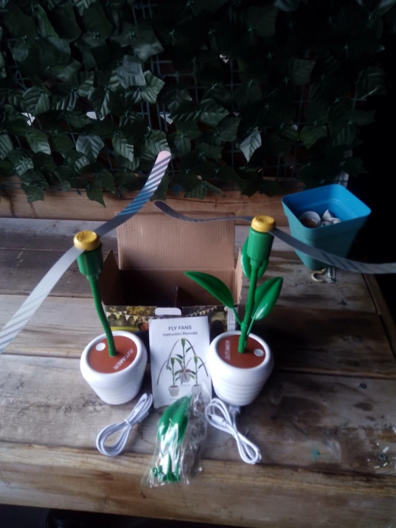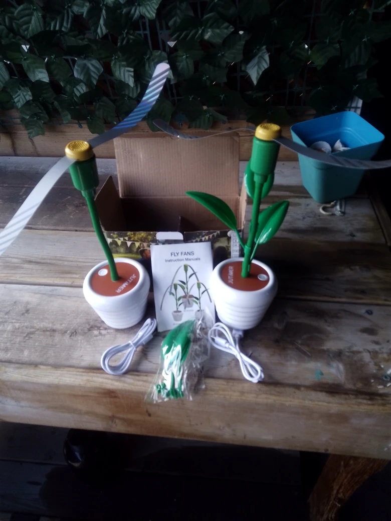 137Keep those pesky bugs away with these Jutimer Fly Fans! They look like little plants in pots, and the spinning blades keep flies away from your food. Comes with the original box, instruction manuals, and USB cables USB powered or battery