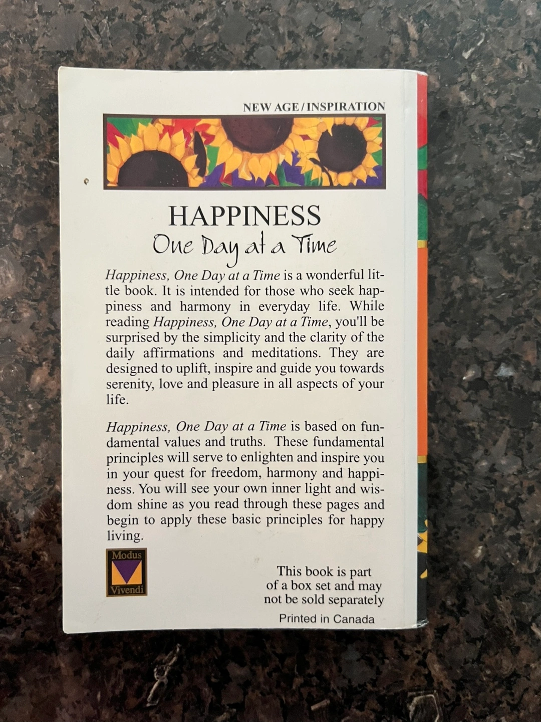Selling the book 'Happiness One Day at a Time'. It's a wonderful little book intended for those who seek happiness and harmony in everyday life. While reading, you'll be surprised by the simplicity and clarity of the daily affirmations and meditations. It is designed to uplift, inspire, and guide you towards serenity, love, and pleasure in all aspects of your life. This book is based on fundamental values and truths to inspire you in your quest for freedom, harmony and happy living