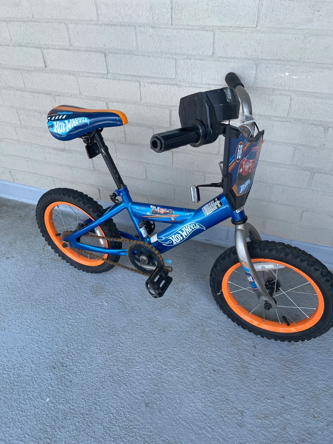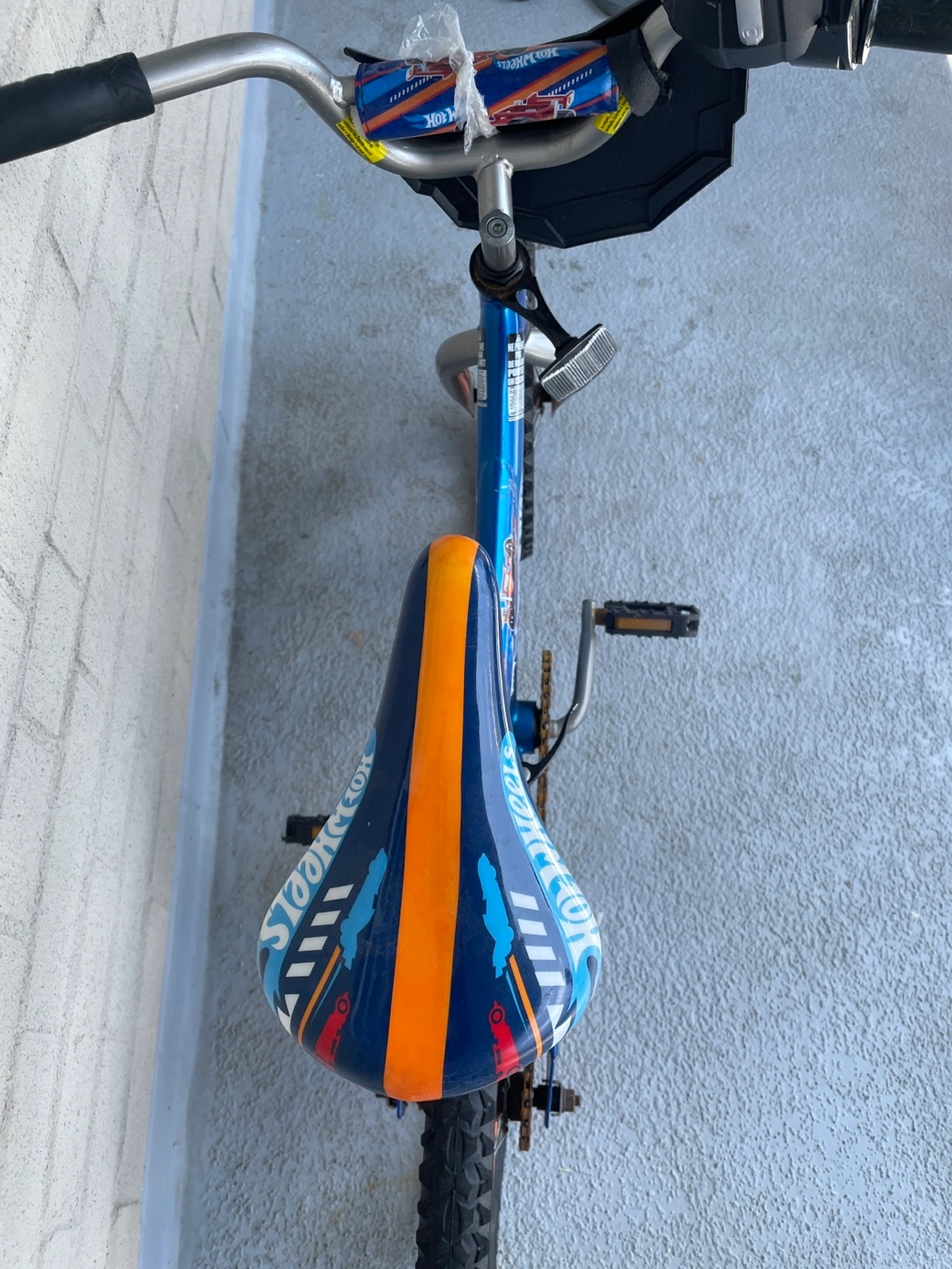 Selling a Hot Wheels themed kids' bike! It's blue with orange accents and Hot Wheels graphics on the frame and seat. Perfect for a young cyclist who loves Hot Wheels!