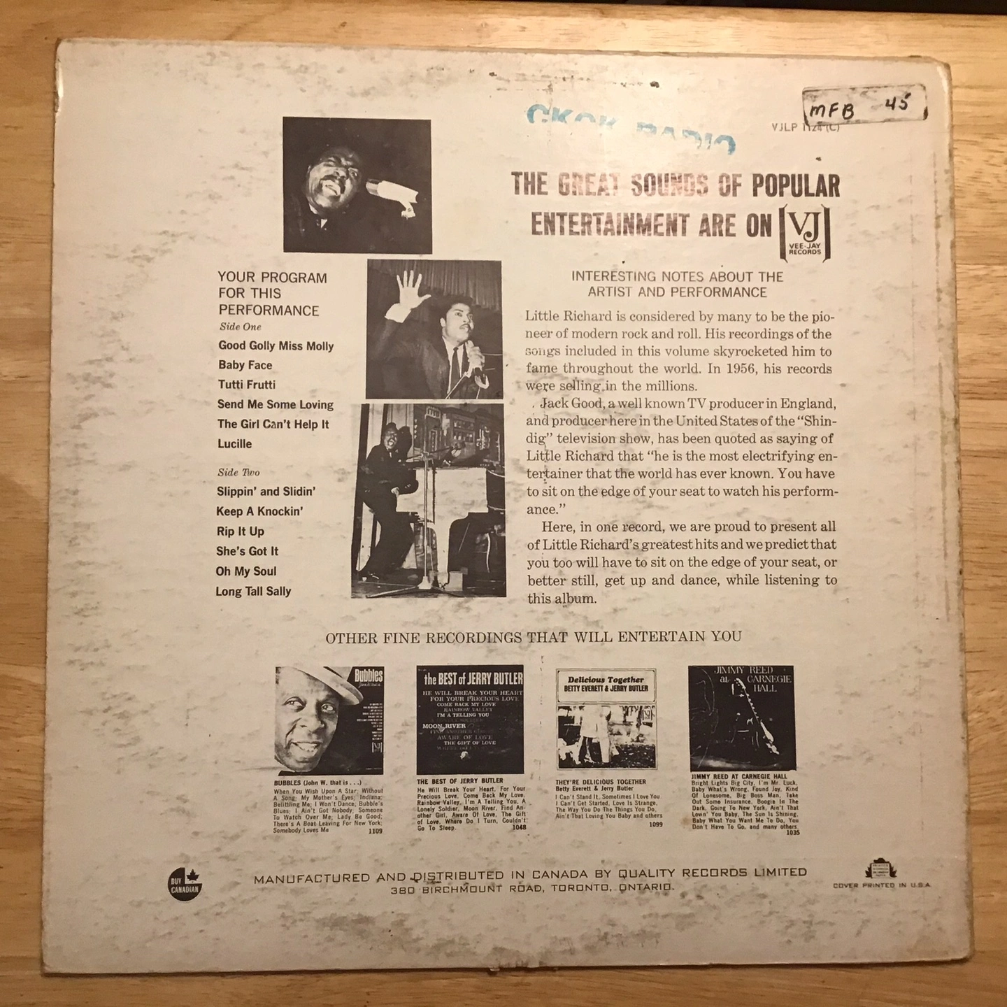 Selling a Little Richard vinyl record, "His Greatest Hits" on the VJ label. This record includes classics like Tutti Frutti, Long Tall Sally, and Good Golly Miss Molly. The record is manufactured and distributed in Canada by Quality Records Limited. 🤩