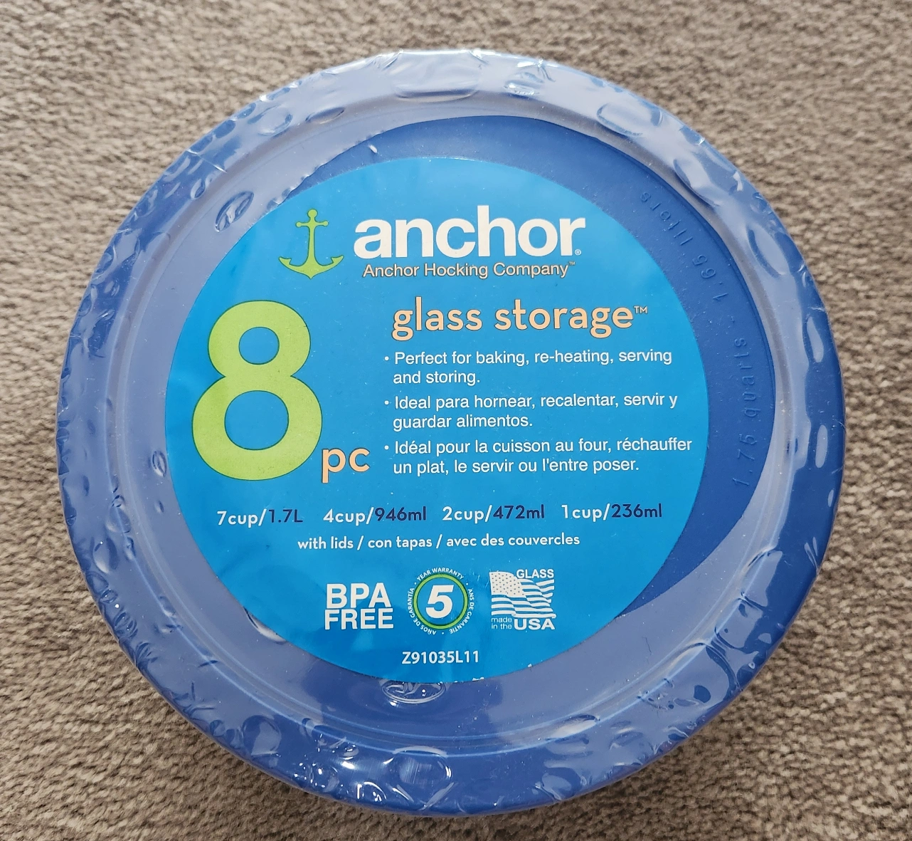 I'm selling a brand new Anchor Hocking 8-piece glass storage set! It's perfect for baking, re-heating, serving, and storing.