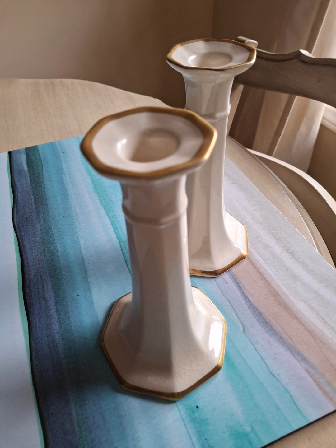 Mason's Patent Ironstone “Ivory” candlestick holders, made in England. Cream & gold coloured. 6.5” high, 2” around at top and 3.5” around at base. Fine crazing on one as shown in last photo. Price is for the pair.