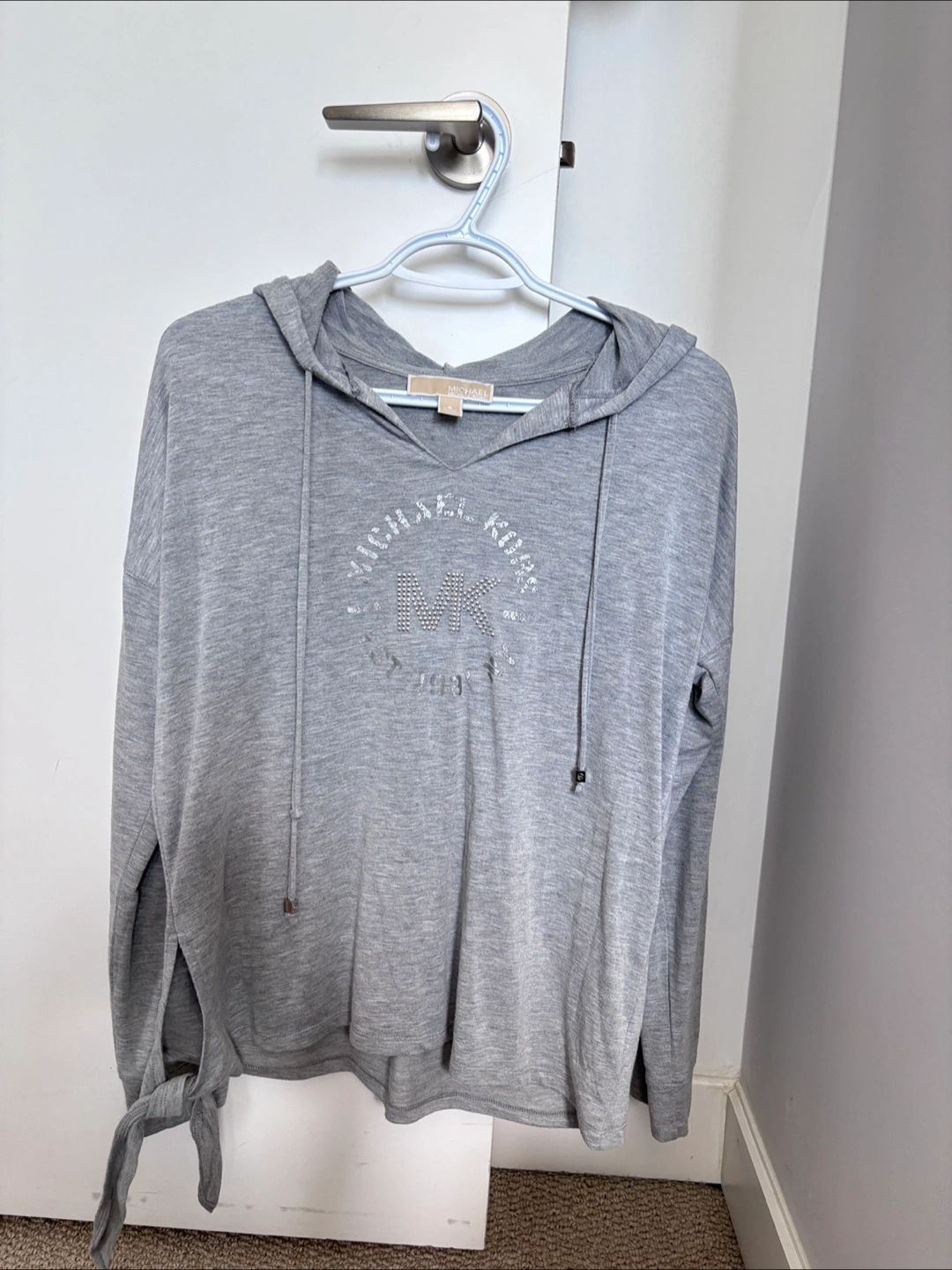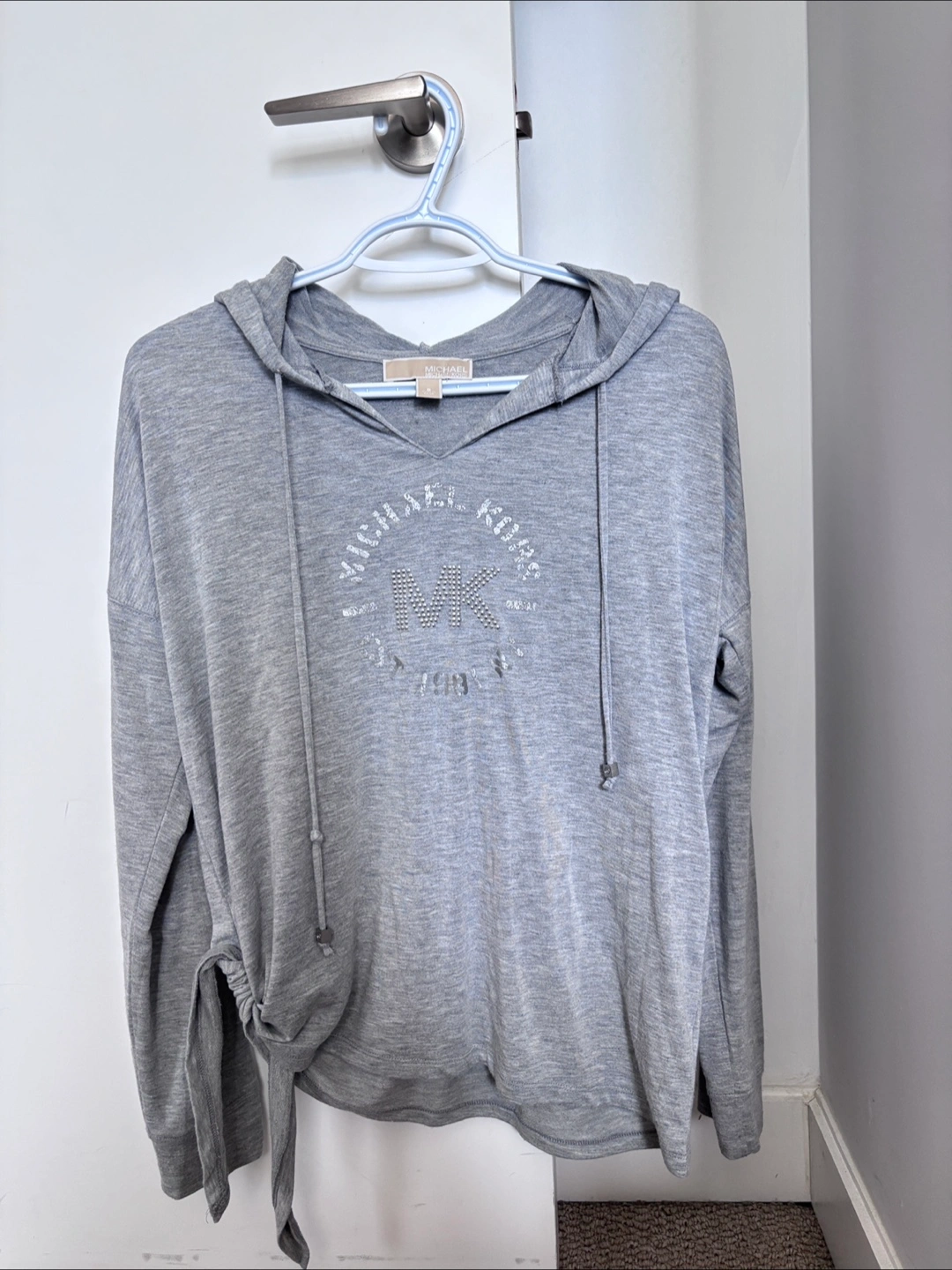 Here’s a Michael Kors hoodie in a lovely grey colour! It features the MK logo with a drawstring hood and a stylish tie detail on the side. Perfect for a casual and comfy look!