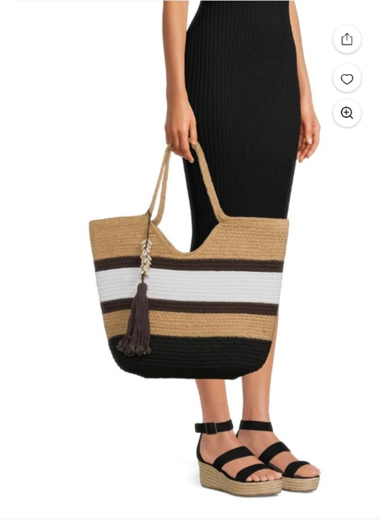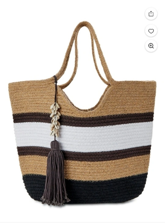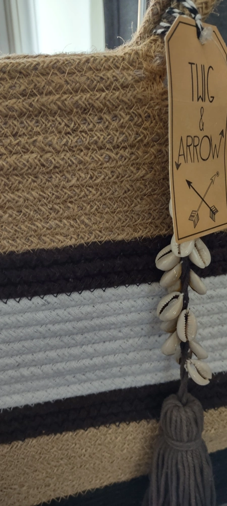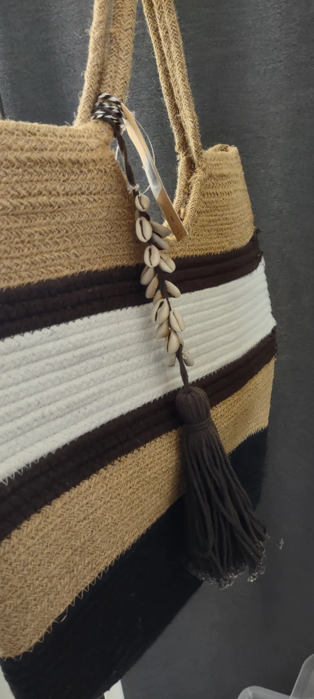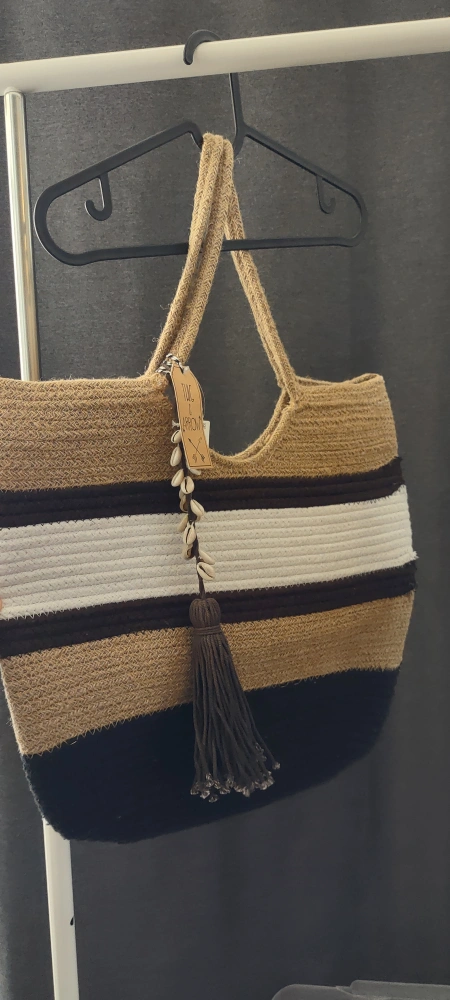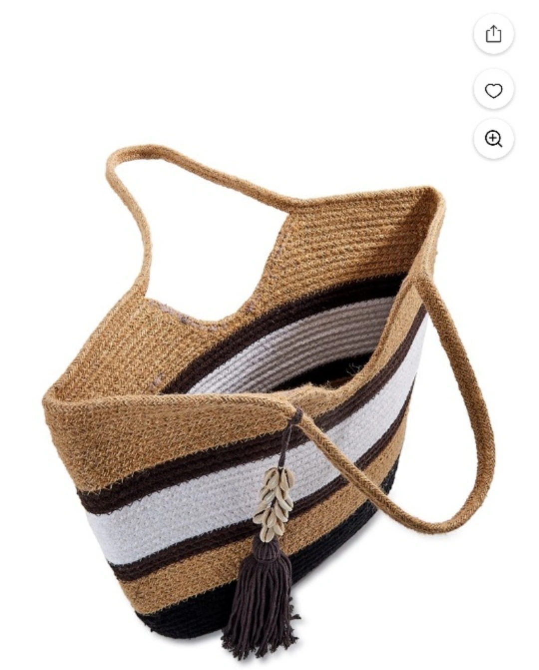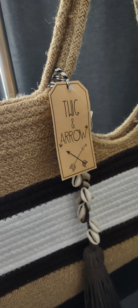1000+Here's a cute tote bag from Twig & Arrow! It features a striped design with a tassel and shell embellishments. Perfect for carrying your essentials in style. New with tag.