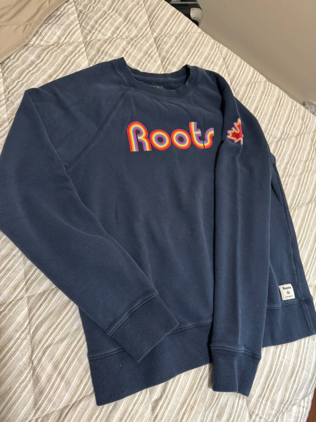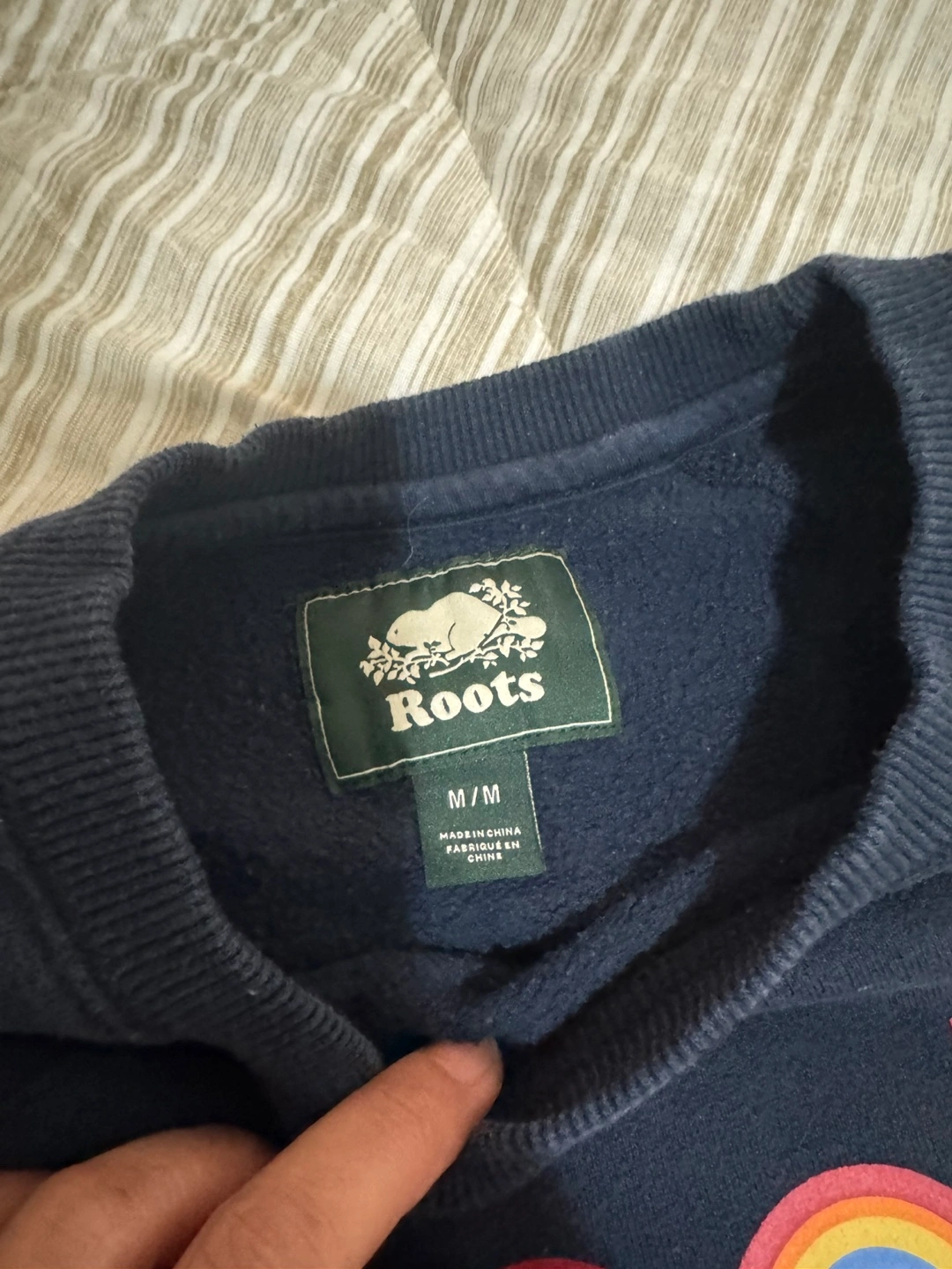 Roots sweatshirt in size M/M. It's a comfy and stylish piece with the classic Roots logo and a fun rainbow design. Perfect for casual wear! used but not abused.