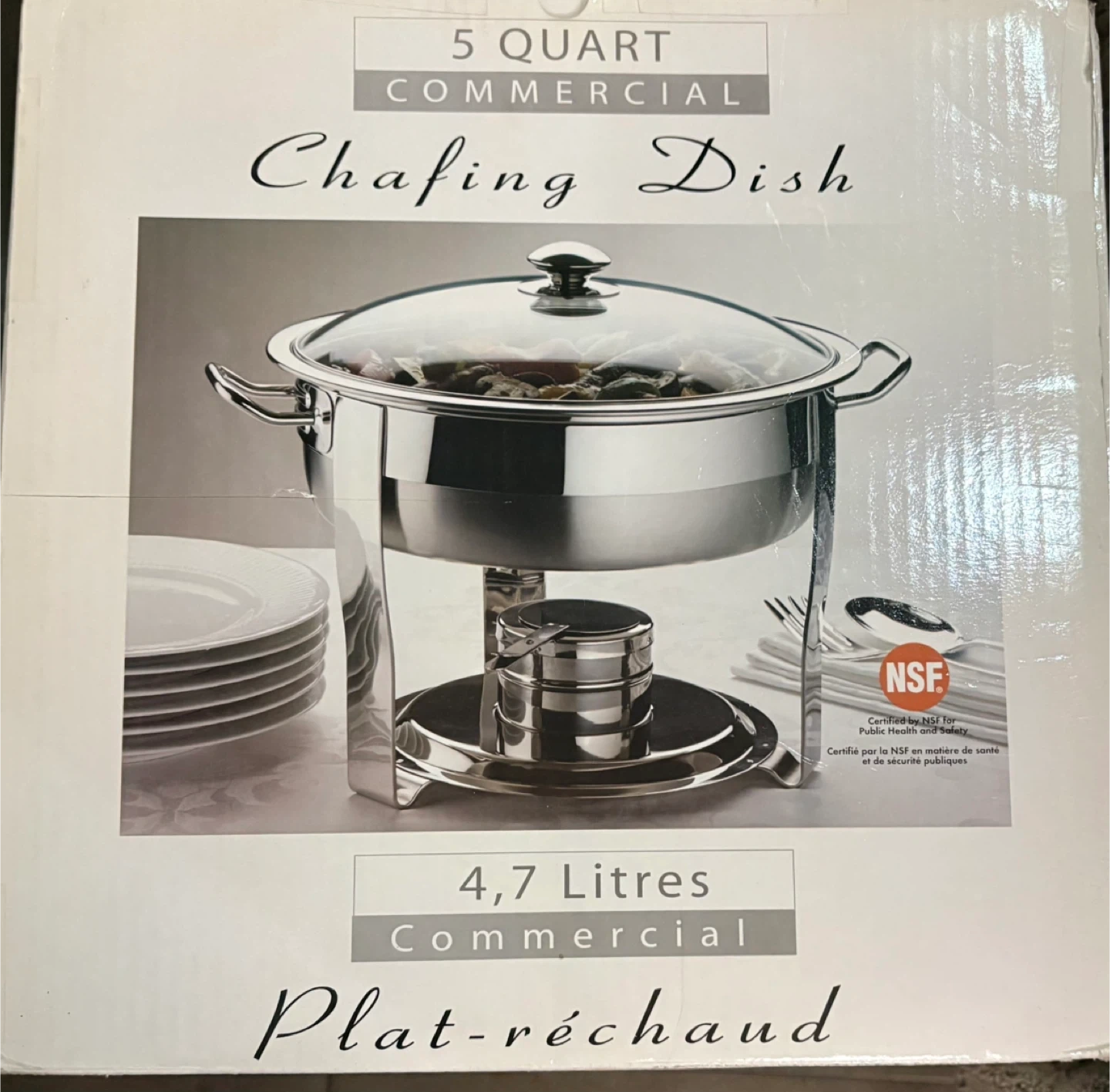 Stainless steel chafing dish with a durable glass lid. It's commercial grade and stackable, making it great for parties or events. Comes with a fuel holder, but the fuel itself isn't included. Dish capacity is 5 litres, with a 33 cm diameter.
