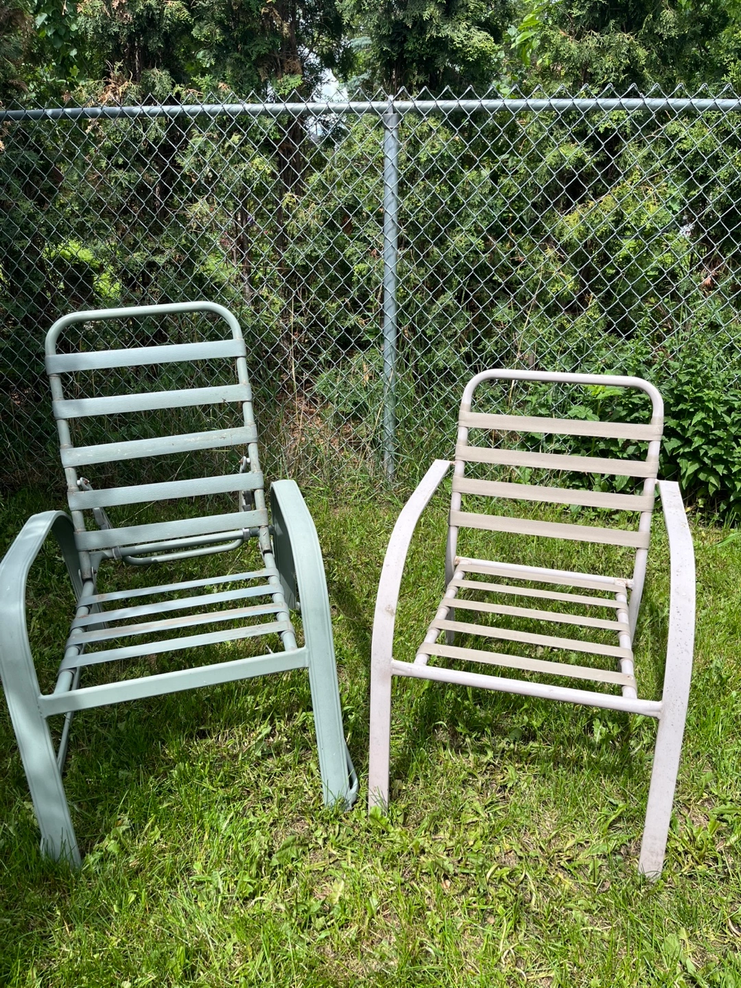 Selling two vintage metal outdoor chairs. They're perfect for relaxing in the backyard or on the patio. One chair is a light blue-green colour and the other is off-white. Both are in good condition for their age!