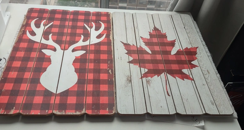 Add a touch of rustic charm to your home with these wood pallet art pieces! One features a classic red and black plaid maple leaf, and the other showcases a white deer silhouette against a matching plaid background. They're perfect for adding a cozy, Canadiana vibe to any room.