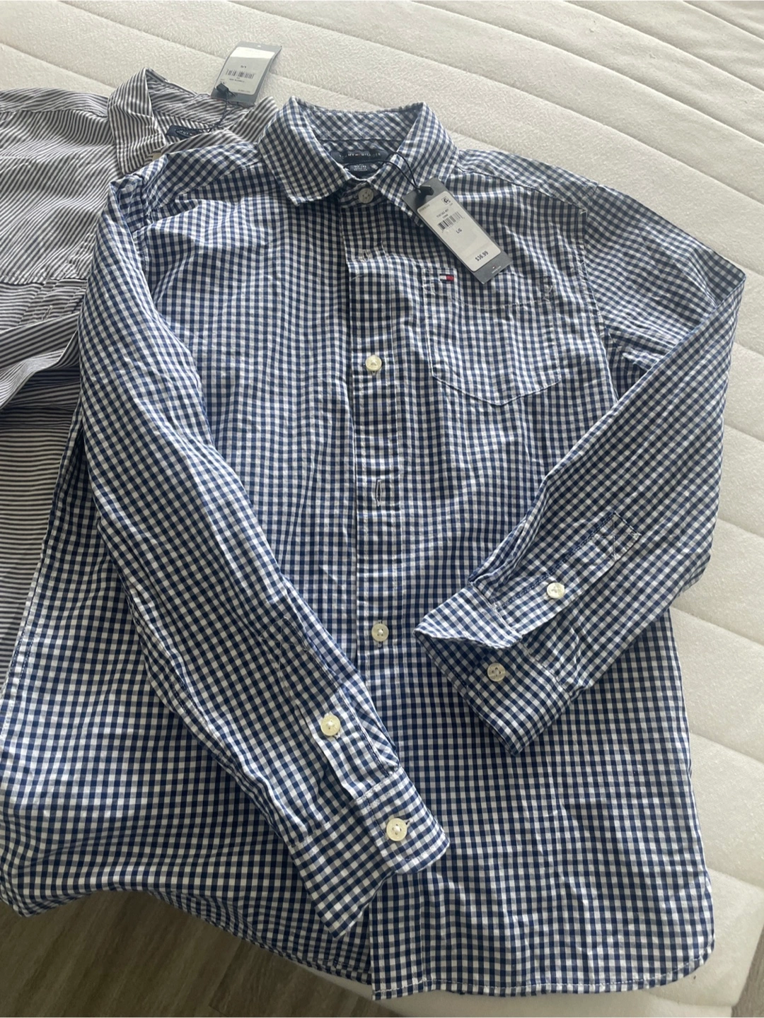 Tommy Hilfiger gingham shirt in boys size large. It's in great condition and ready for a new home! The classic gingham pattern makes it a versatile addition to any wardrobe new with tags