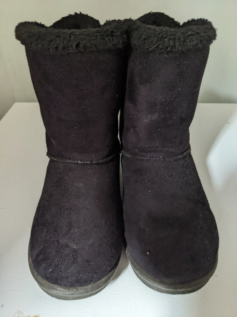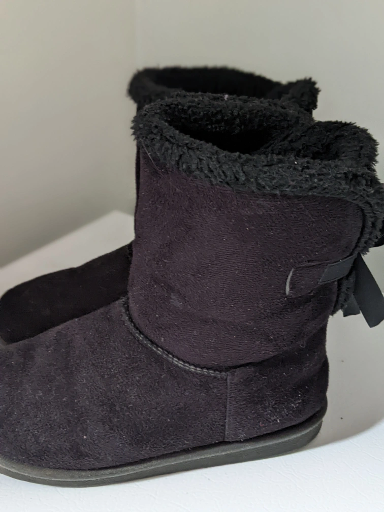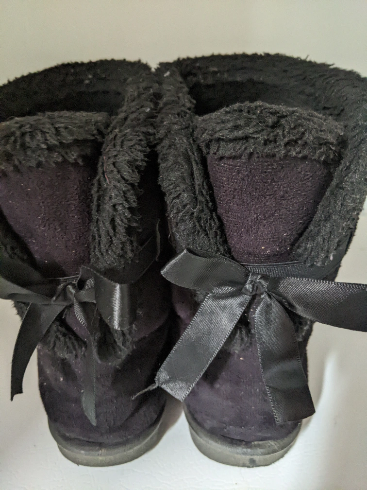 Cozy black boots, perfect for keeping your feet warm and stylish! They feature a cute bow detail on the back and soft lining inside. These boots are in great condition and ready for a new home!