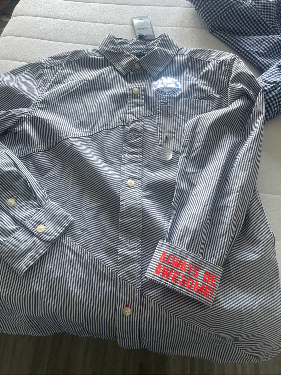 Here's a stylish boys Style shirt in size L. It features a classic striped pattern and the words 'ALWAYS BE AWESOME!' on the cuff. Perfect for adding a touch of flair to your wardrobe! New with tags