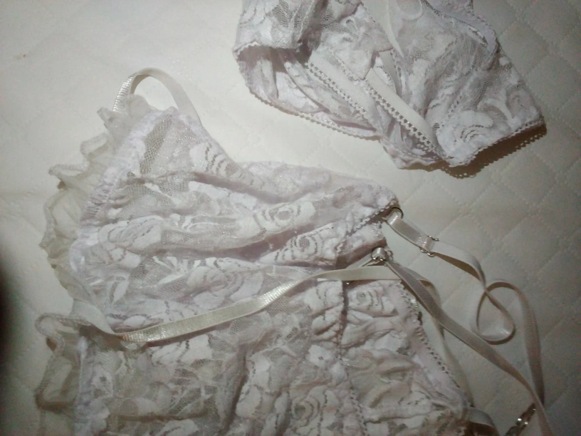 delicate white lace lingerie set. It appears to be in good condition and features a floral lace pattern. Perfect for adding a touch of elegance to your wardrobe!