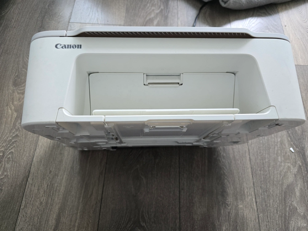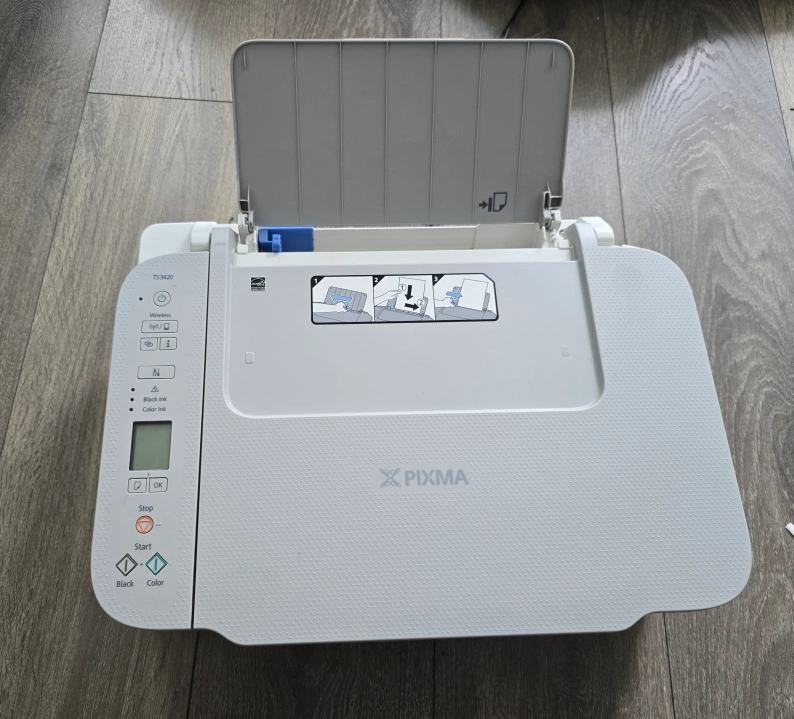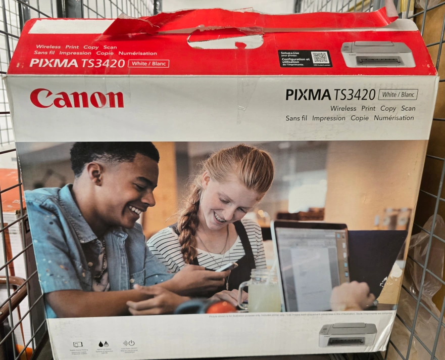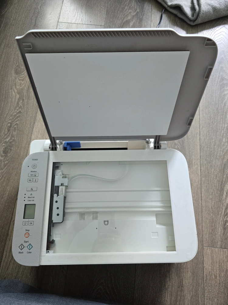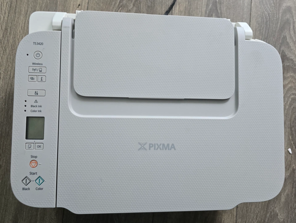 Selling a Canon PIXMA TS3420 printer in white! It's a wireless printer that can print, copy, and scan. It comes with the box