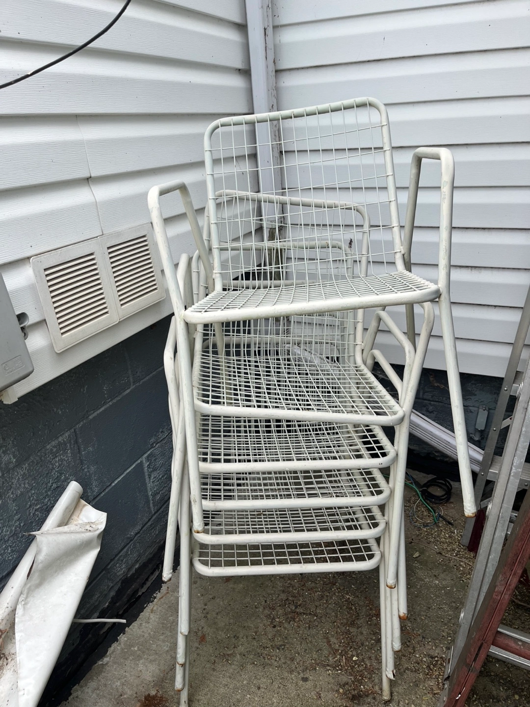 Selling a set of 6 white metal wire chairs. Sturdy. They're stackable for easy storage. Great for outdoor or indoor use!