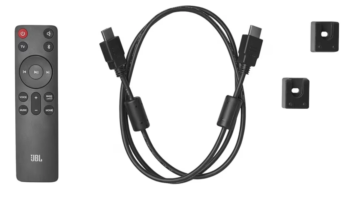 It comes with original package, the remote control, HDMI cable. The dimensions are 95 cm x 10.5 cm x 6.7 cm.