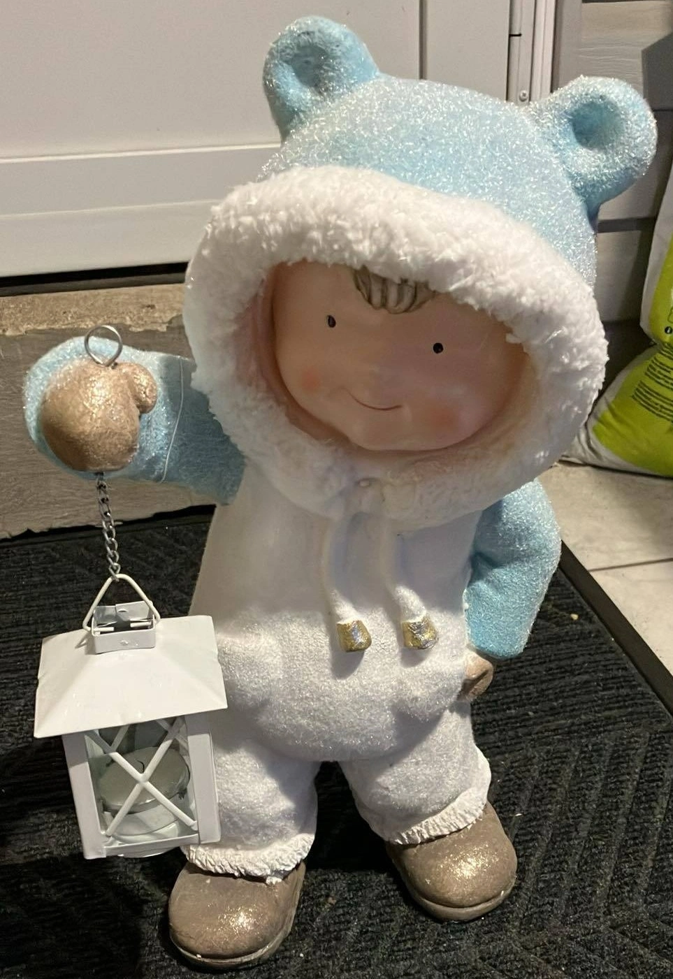 This adorable snowman statue is ready to brighten up any space! It's wearing a fluffy blue outfit and holding a little lantern. Perfect for adding a touch of winter charm to your home