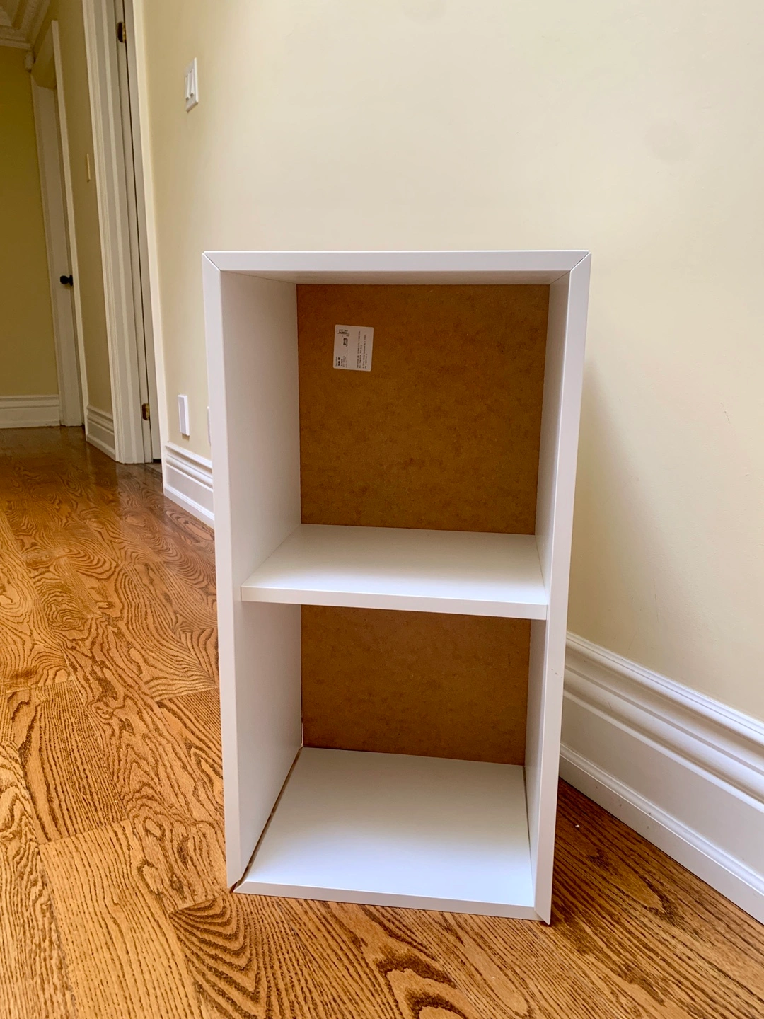 Selling a simple and clean white 2-shelf unit. It's in great shape and perfect for adding some extra storage to any room in your home or office. It's a versatile piece that can be used for books, decor, or anything else you need to keep organized