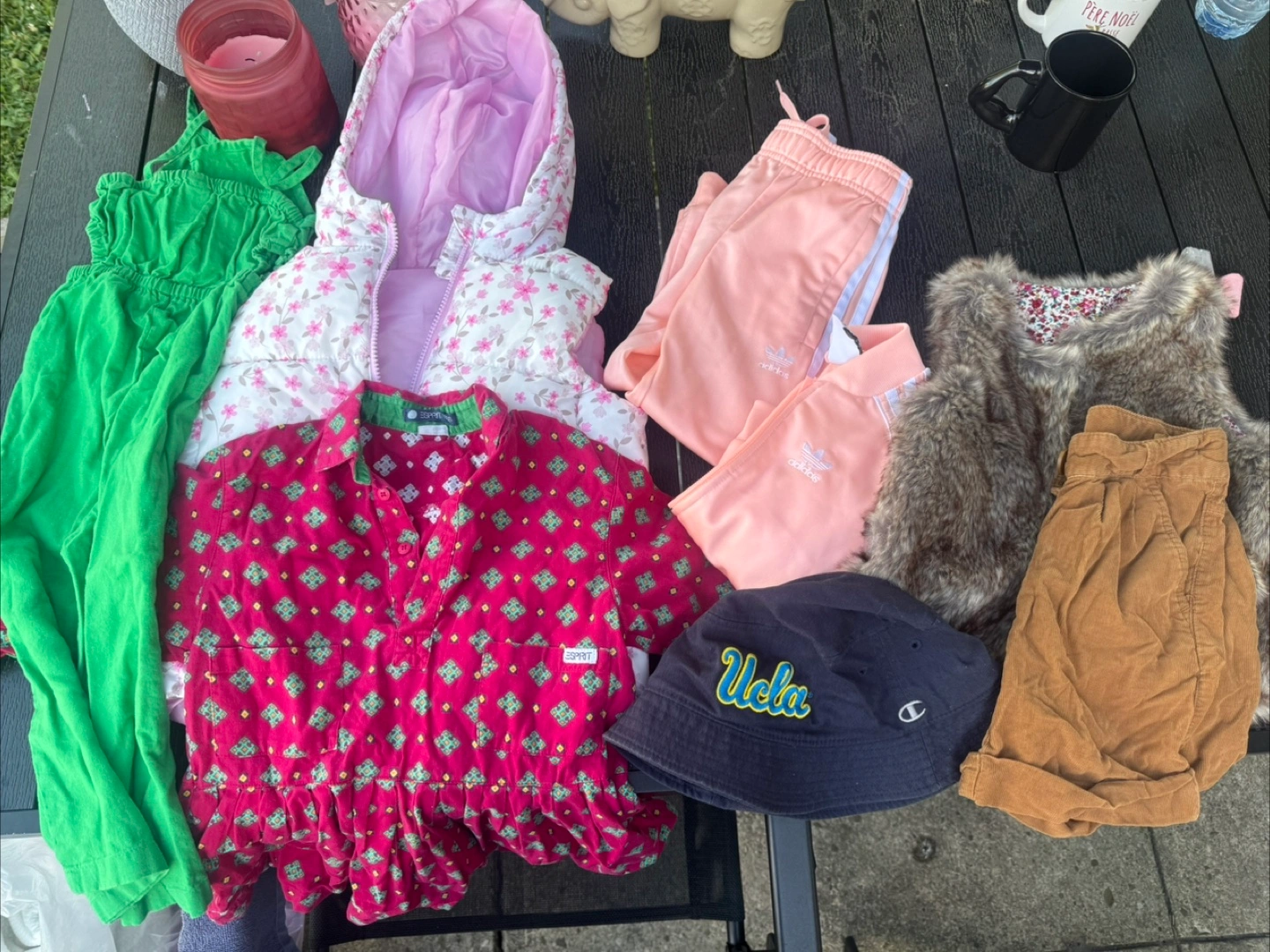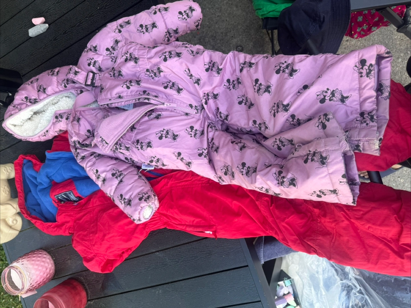 Selling a bundle of kids' clothing! It includes a pair of Kamik winter boots in black and pink, a pink snowsuit with a Mickey Mouse pattern, and various other clothing items. Perfect for keeping your little one warm and stylish this winter season