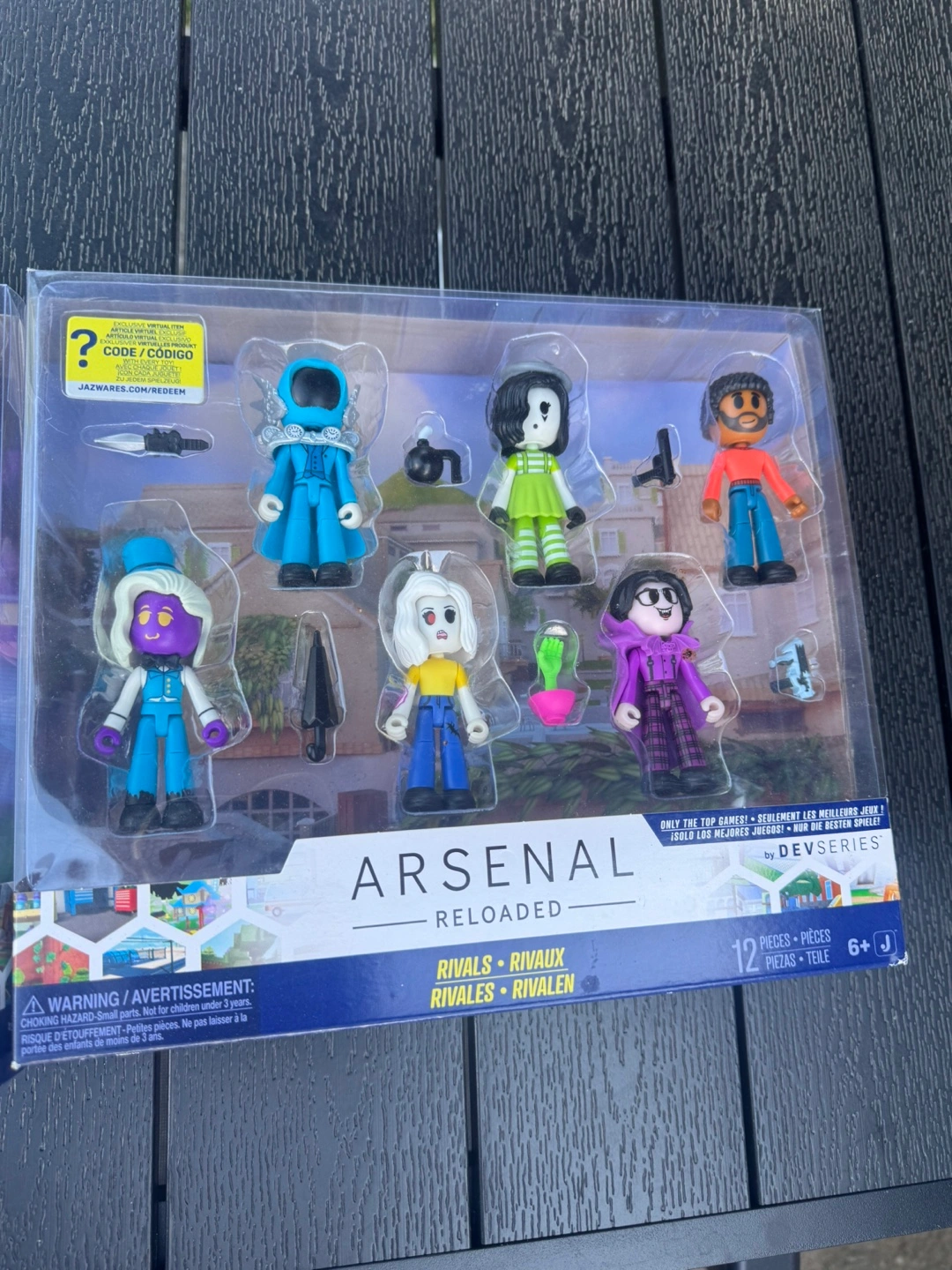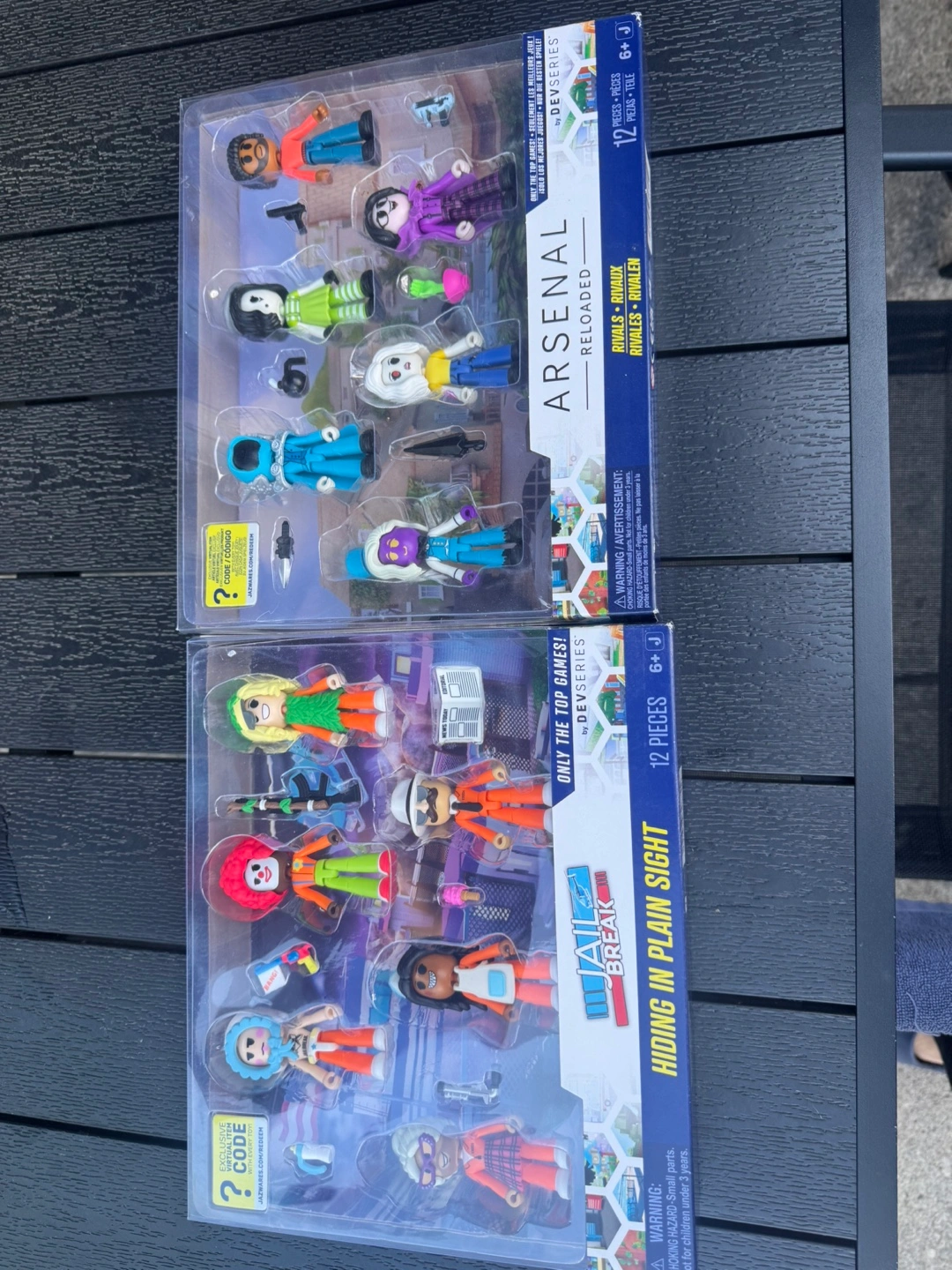 Selling two Jazwares toy sets: Jailbreak Hiding in Plain Sight and Arsenal Reloaded by DevSeries. Both sets include 12 pieces and are recommended for ages 6+