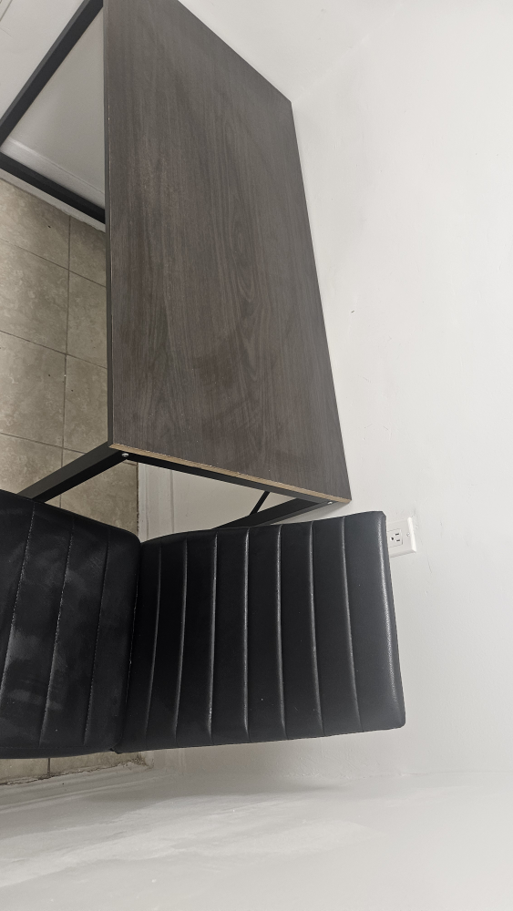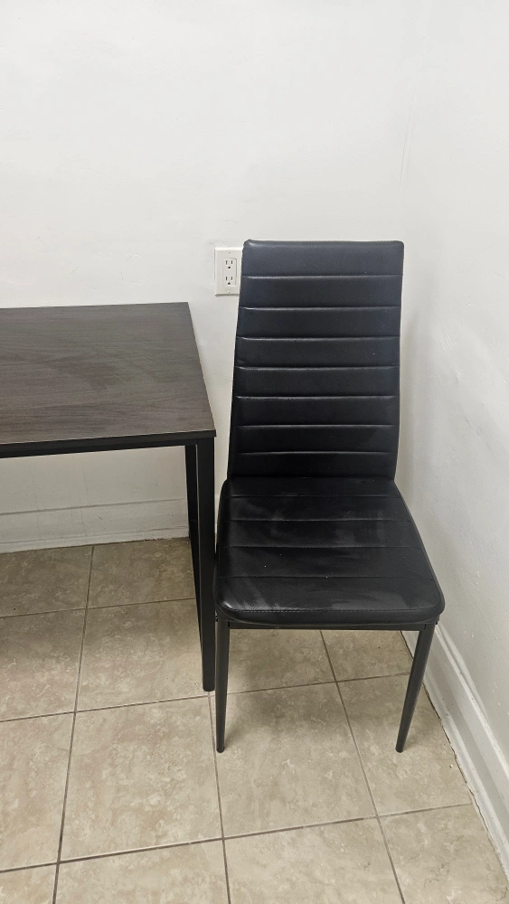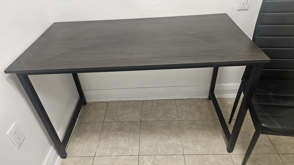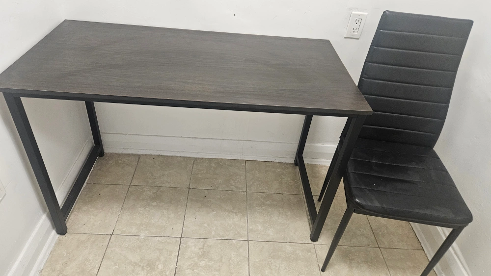 Selling a dark brown desk with a sleek black chair. It's a great set for a home office or study space. The desk has a wood-like finish and a sturdy metal frame. The chair is also in great condition and very comfortable!