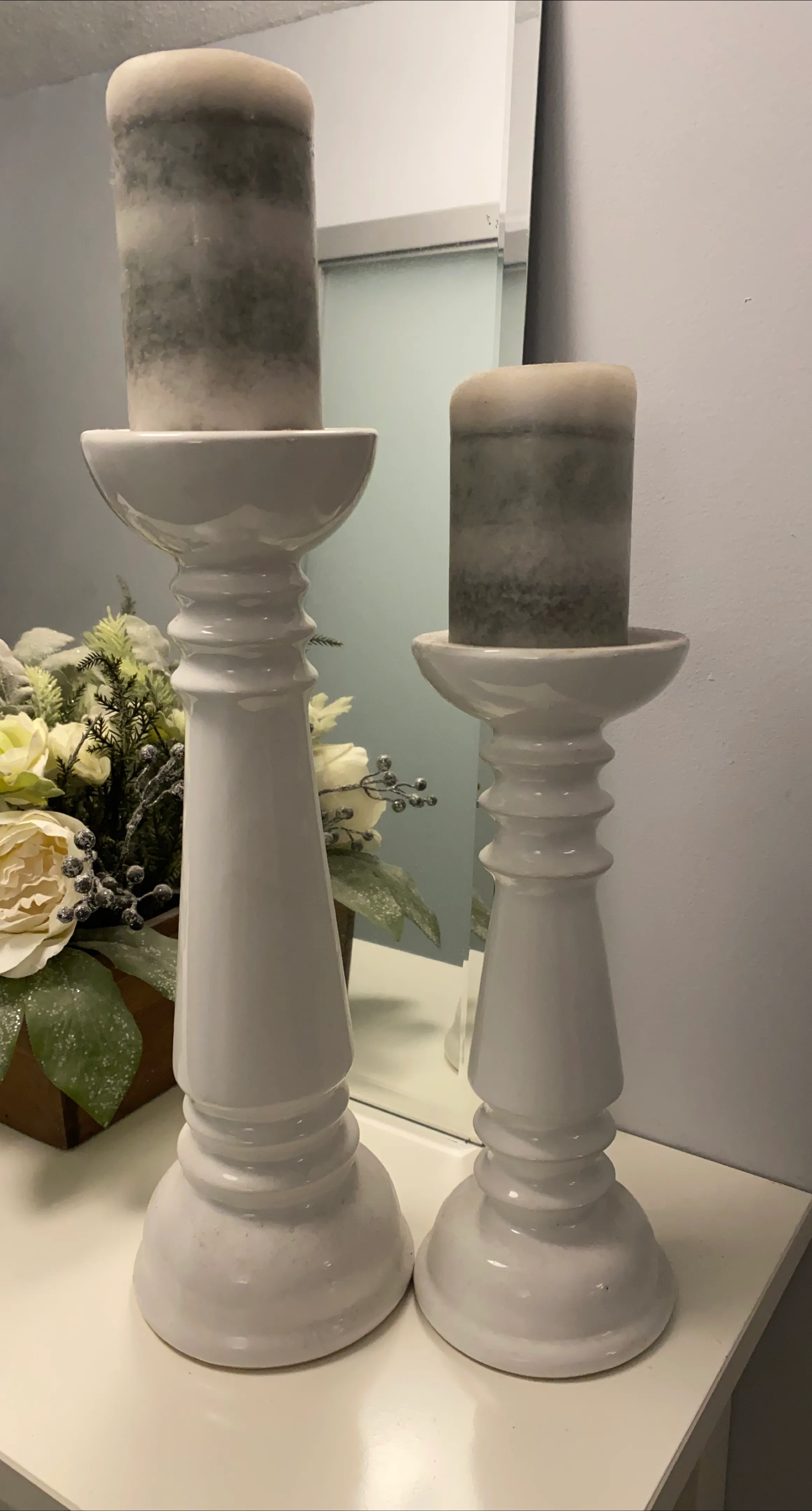 Selling a set of two ceramic candle holders. They are white and in good condition. Perfect for adding a touch of elegance to your home decor!