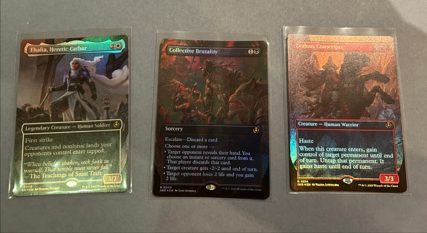 Selling a set of three Magic The Gathering cards: Thalia, Heretic Cathar; Collective Brutality; and Zealous Conscripts from INNISTRAD REMASTERED.