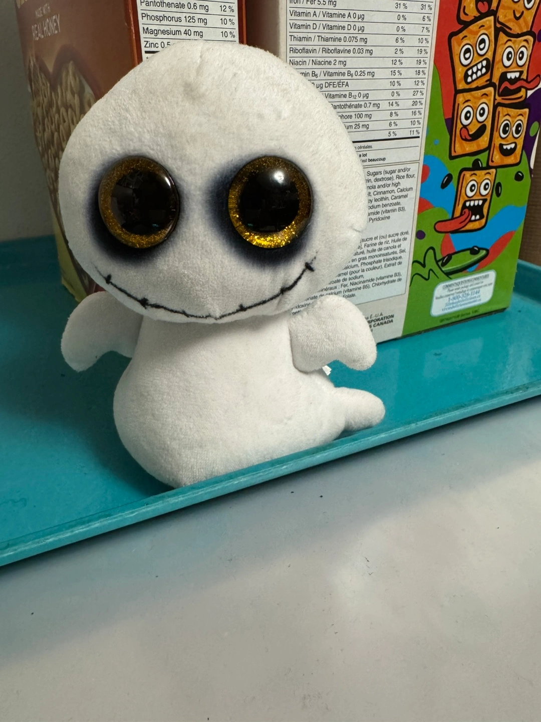 This adorable ghost plushie is looking for a new home! It's in great condition and ready to bring some spooky charm to your space. The plushie is white with big, sparkly gold eyes and a stitched smile. It's super soft and cuddly, perfect for kids or anyone who loves cute and creepy things