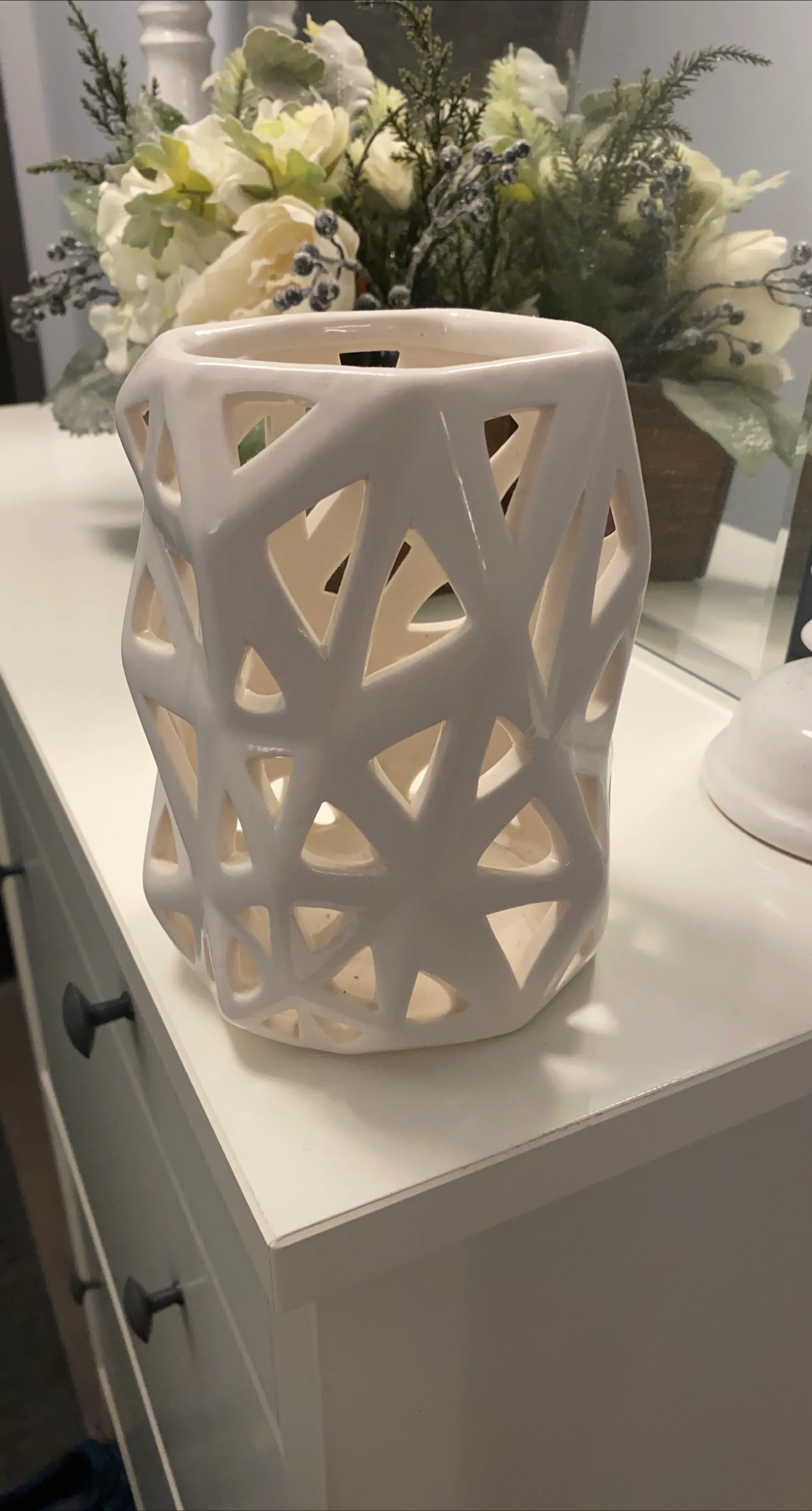 Selling a lovely white ceramic candle holder! It has a unique geometric design with cutouts, perfect for adding a touch of modern elegance to your home decor