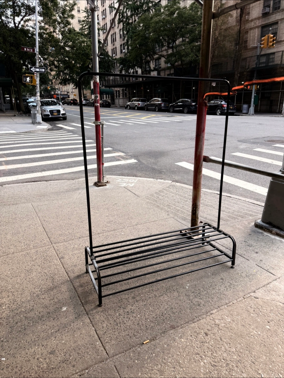 Free a simple black metal clothing rack. It's in good condition and perfect for adding extra storage to your closet or creating a pop-up shop display