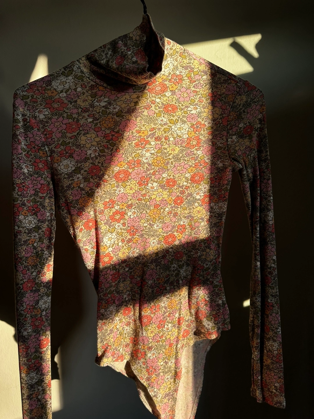 Here's a cute floral print long-sleeve bodysuit! It's perfect for layering or wearing on its own. The material is soft and comfortable, great for any occasion