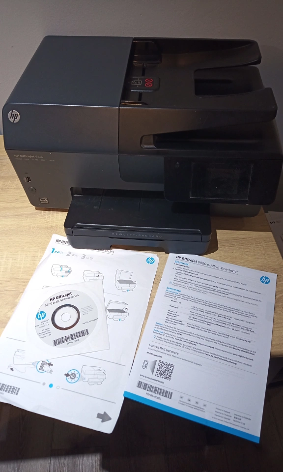 HP Officejet 6800 e-All-in-One series printer. It comes with the power cable, setup guide, installation CD, all 4 colour and black inks (used) plus brand new black and cyan replacement cartridges.