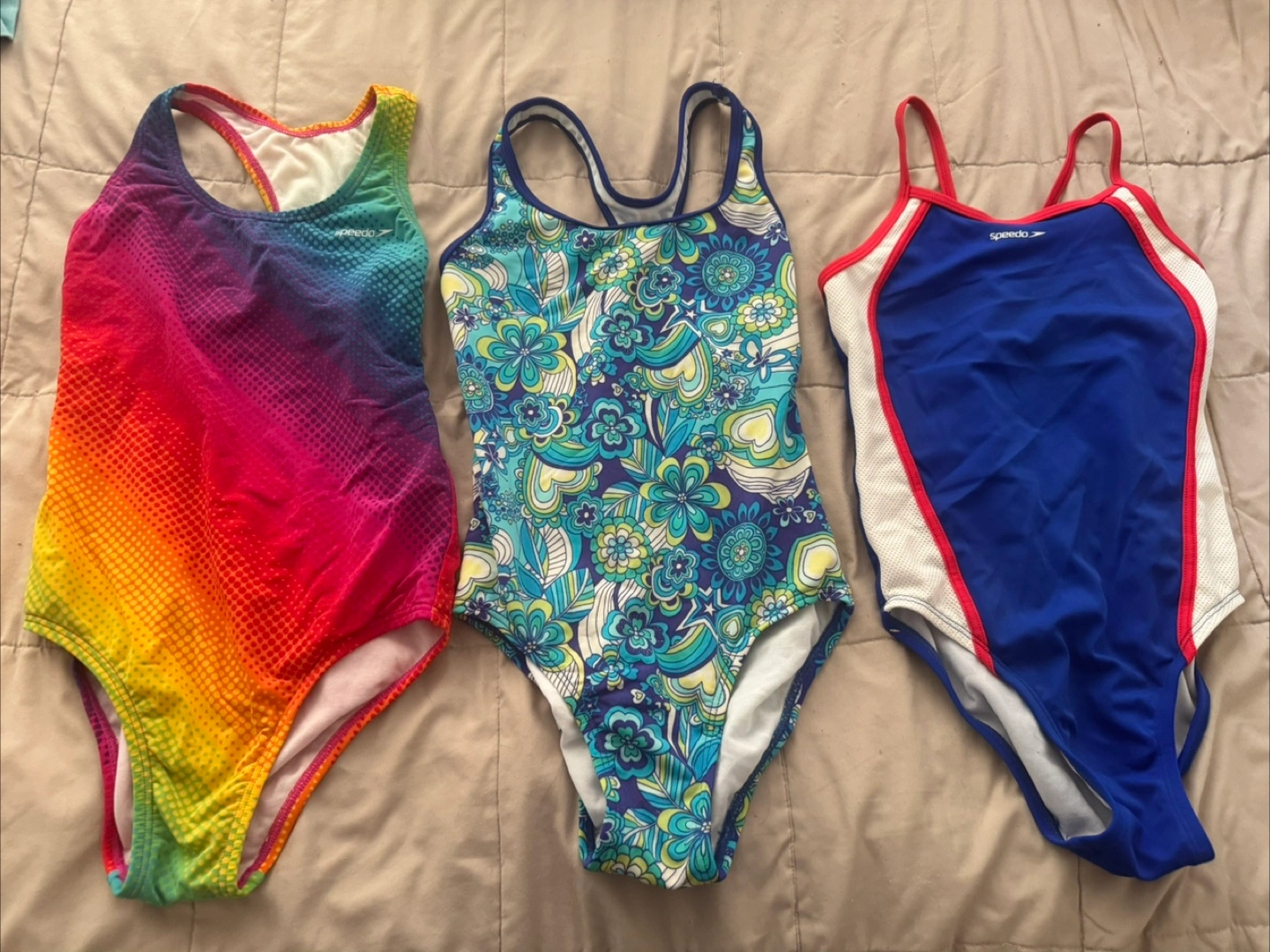 Selling a set of three gently used Speedo swimsuits! They're in great shape and ready for the pool or beach. The set includes a rainbow gradient suit, a floral patterned suit, and a red, white, and blue suit. Perfect for young swimmers!