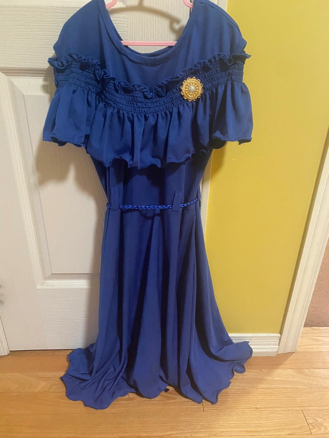 1000+This is a lovely blue dress with ruffle details on the top and sleeves. It has a belt around the waist. Perfect for a party or special occasion!