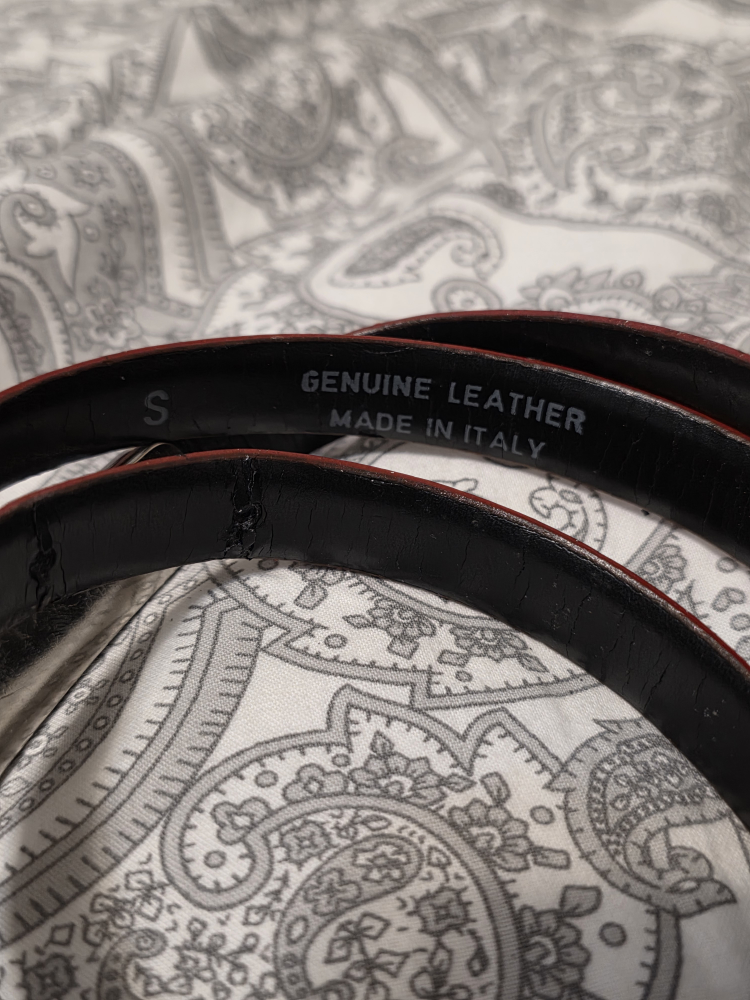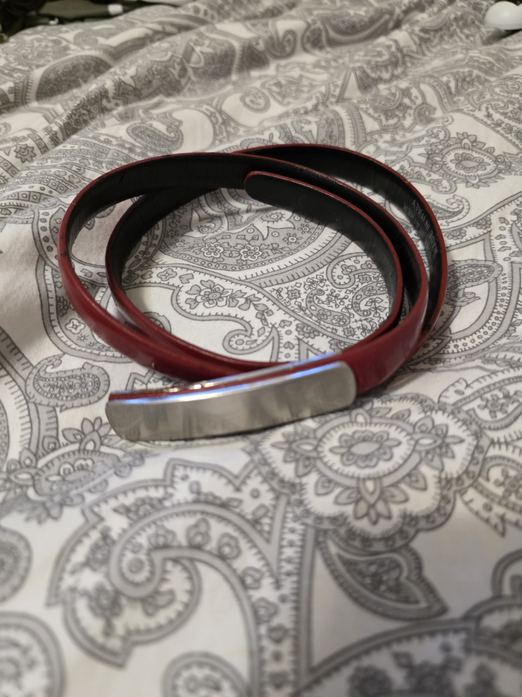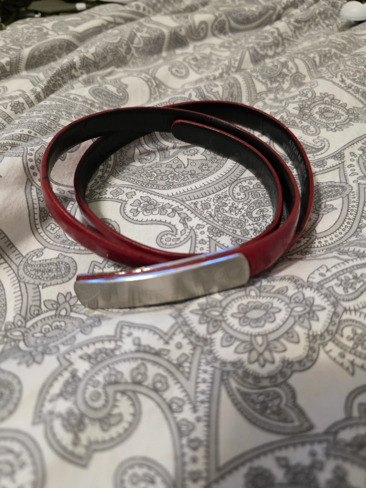Selling a genuine leather belt! It's a size small and made in Italy. The belt is red on the outside and black on the inside. It has a silver-colored buckle.