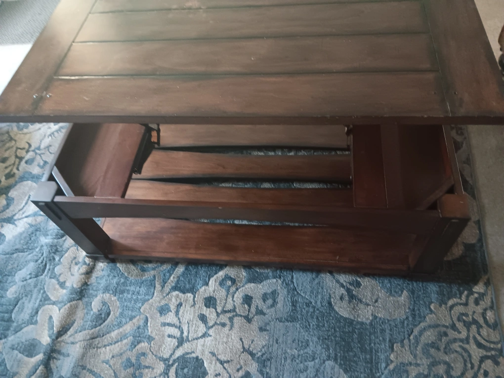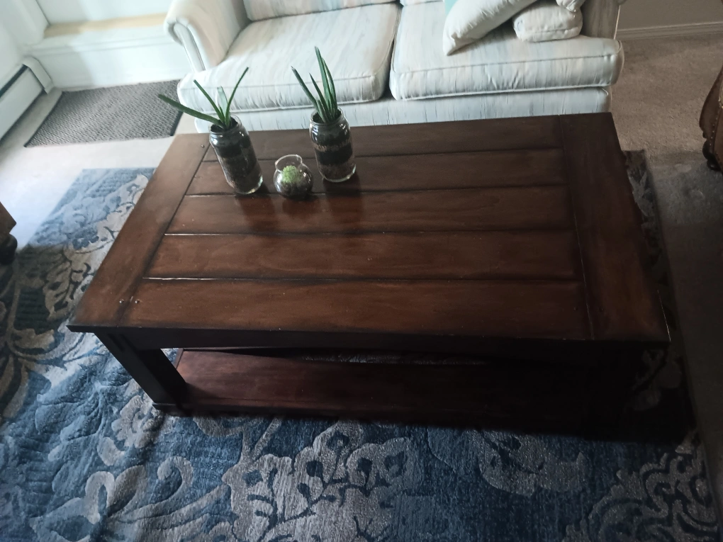 Selling a wooden coffee table, perfect for any living room! It has a rich, dark finish and a sturdy design. There's a convenient shelf underneath for storage or decor. It's in great condition and ready for a new home