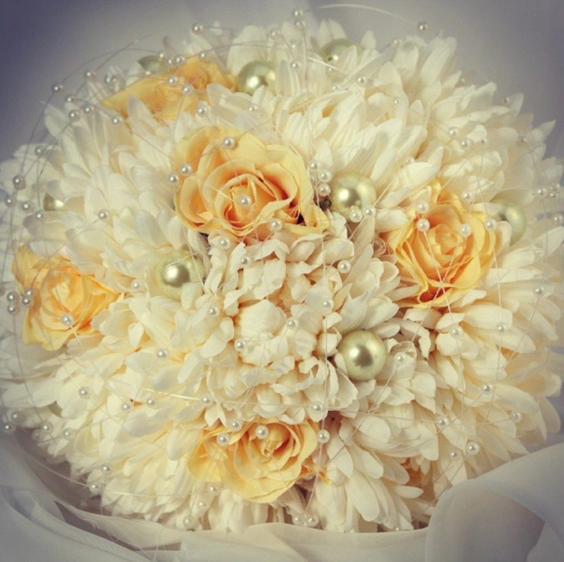 Beautiful wedding bouquet featuring white and yellow flowers with pearl accents. Perfect for a wedding or special event