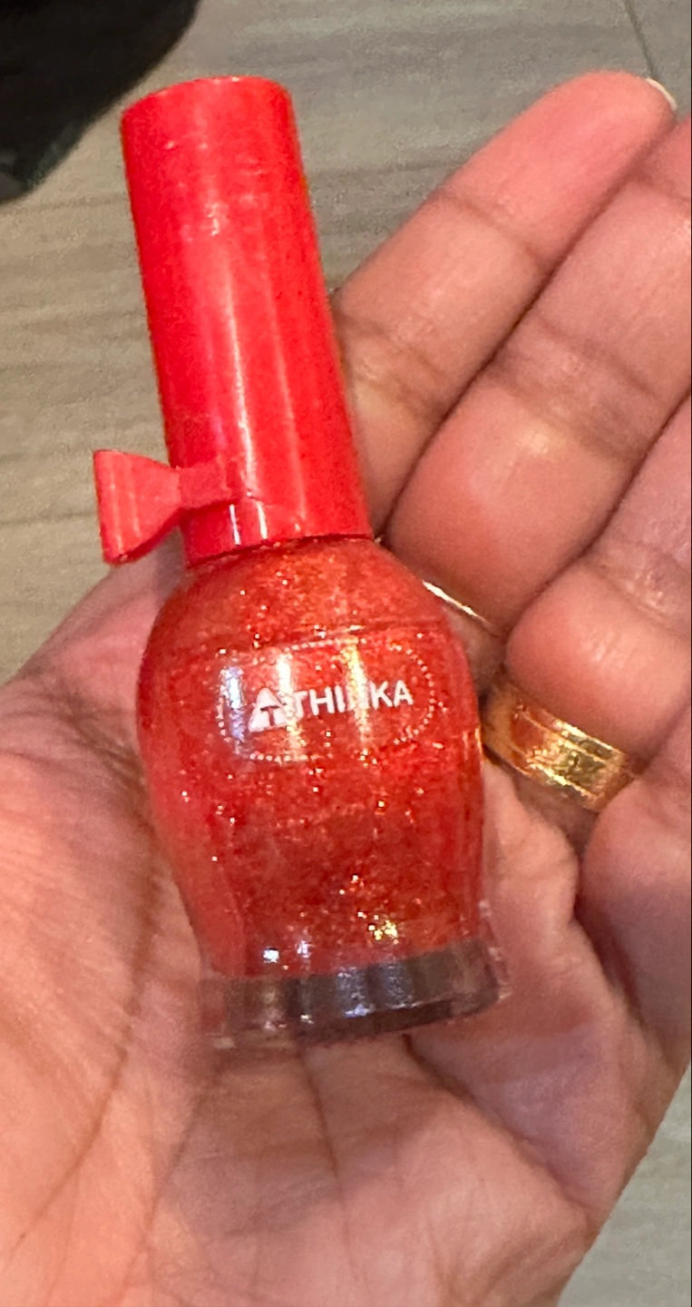 Here's a bottle of Athika nail polish in a lovely red glitter colour! It's perfect for adding a bit of sparkle to your nails