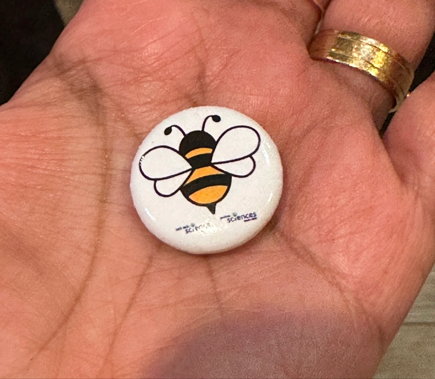 Cute button pin featuring a bee design from Science Sciences! Perfect for adding a touch of whimsy to your bag or jacket