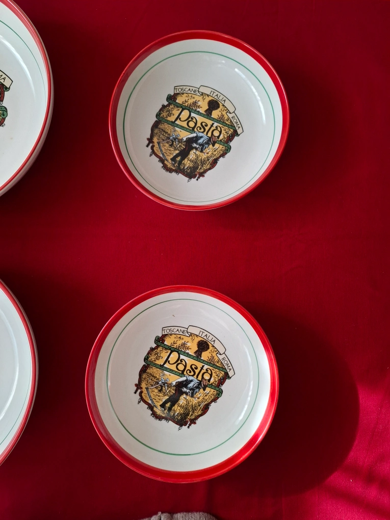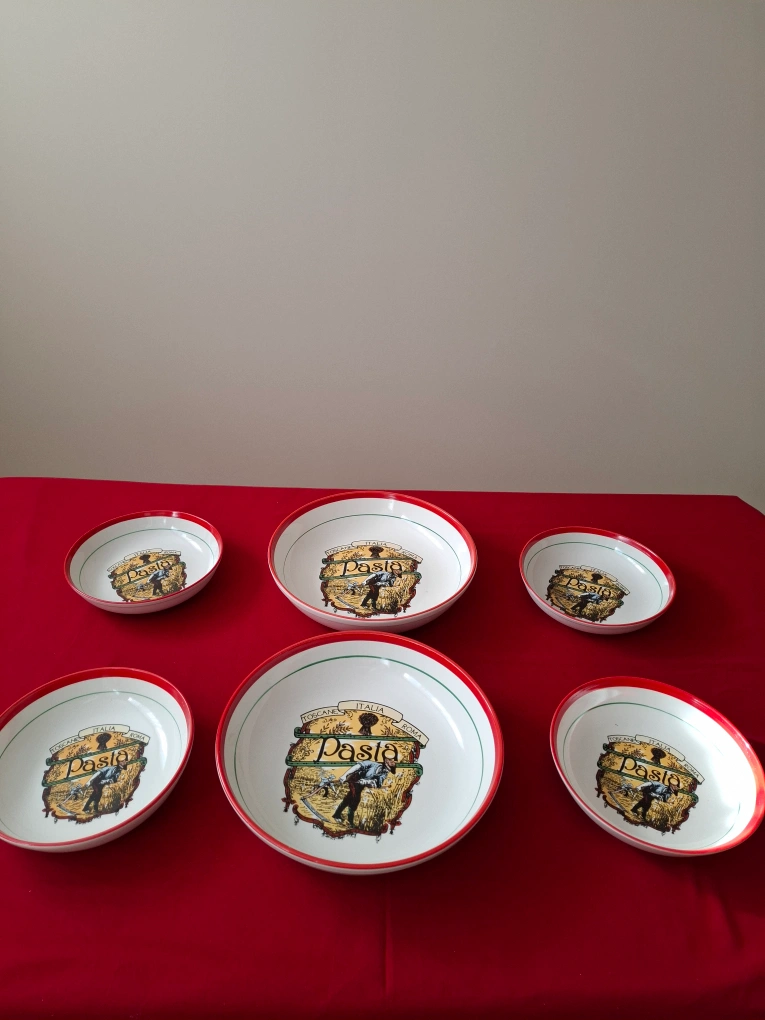 Selling a set of 6 pasta bowls with a charming Italian design! These bowls feature a white base with a red and green rim and a detailed illustration in the centre. Two large serving bowls (11") and four regular pasta bowls (8").