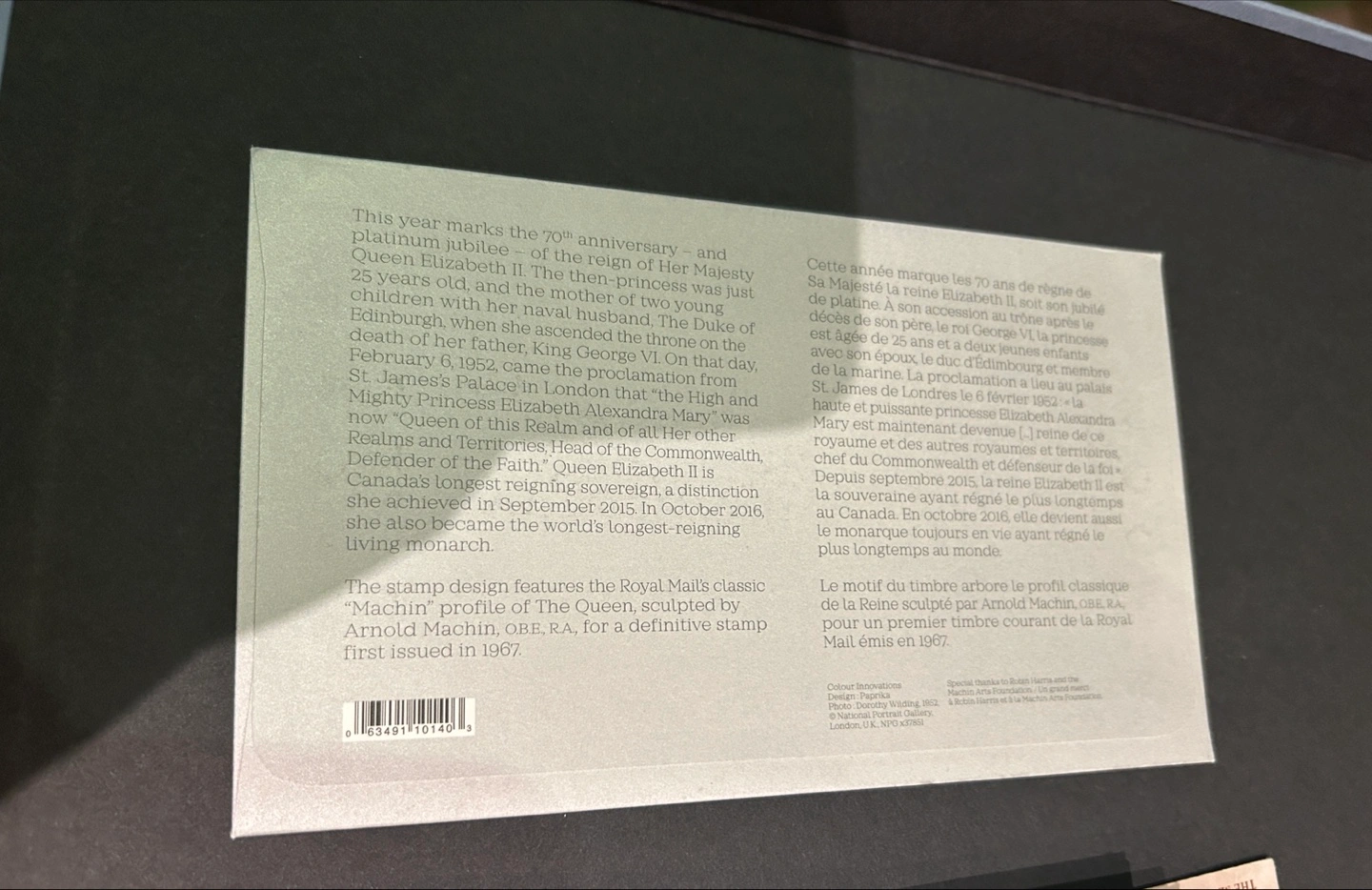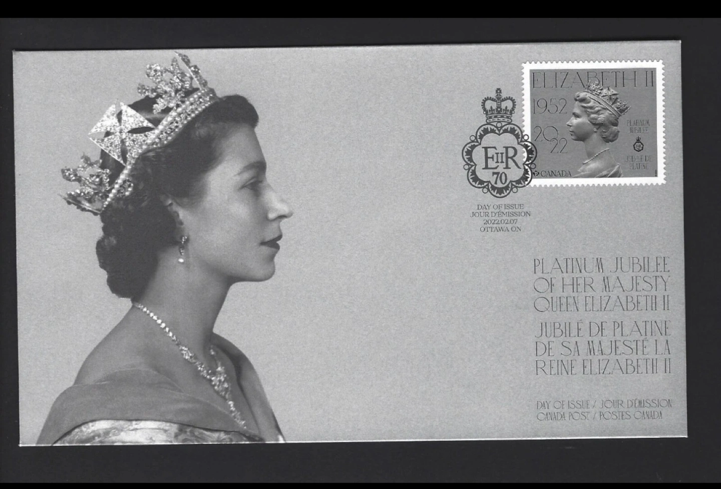 Commemorate Queen Elizabeth II's Platinum Jubilee with this special edition first day cover! It marks her 70th anniversary and platinum jubilee as the Queen of Canada.