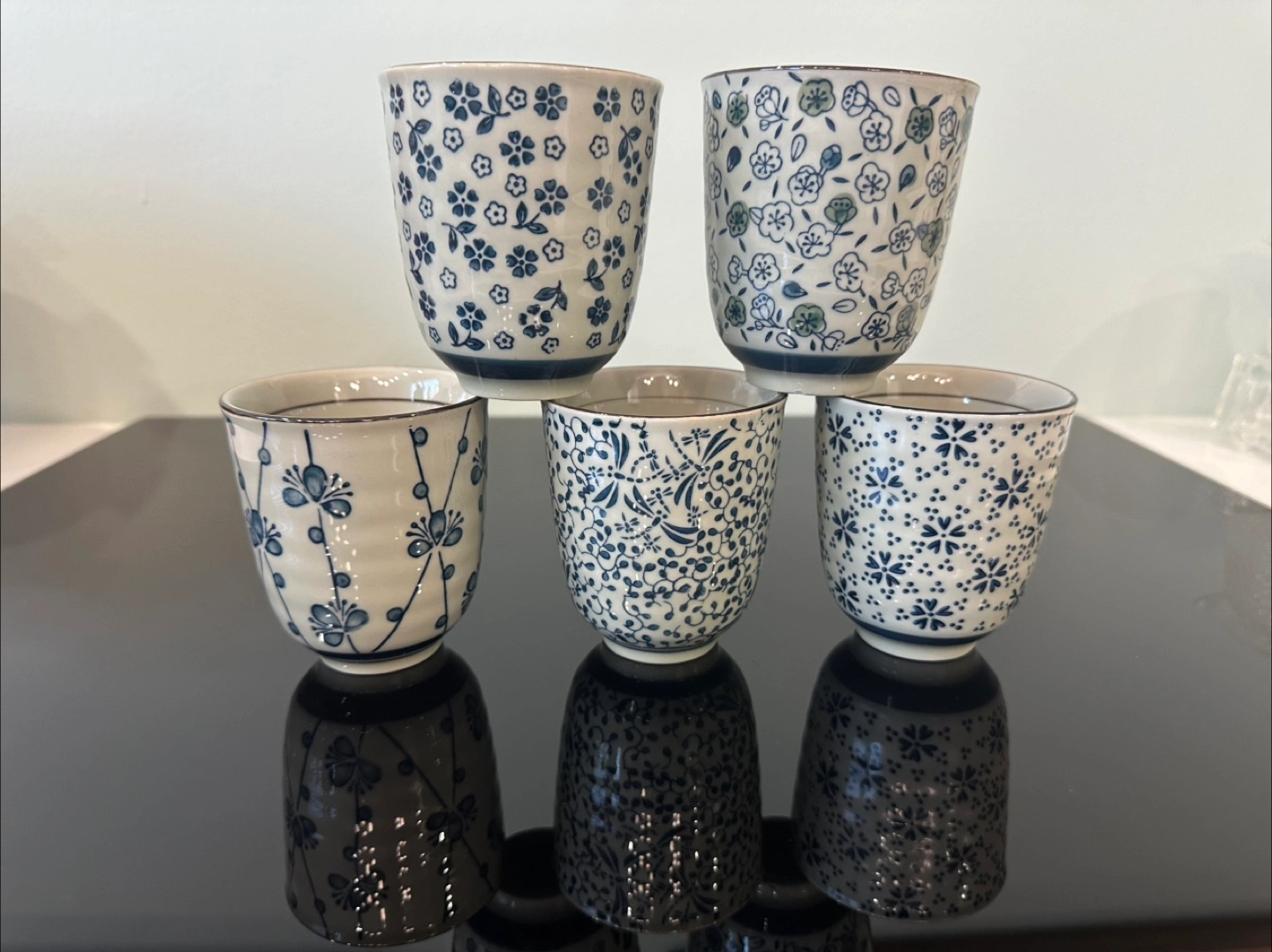 Selling a set of five lovely Japanese tea cups. They feature delicate floral patterns in shades of blue and white. Perfect for adding a touch of elegance to your tea time