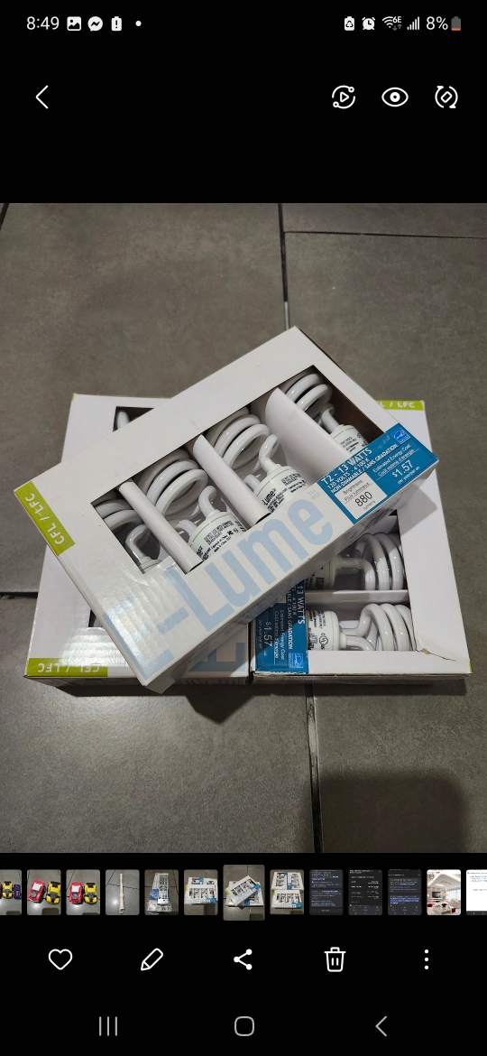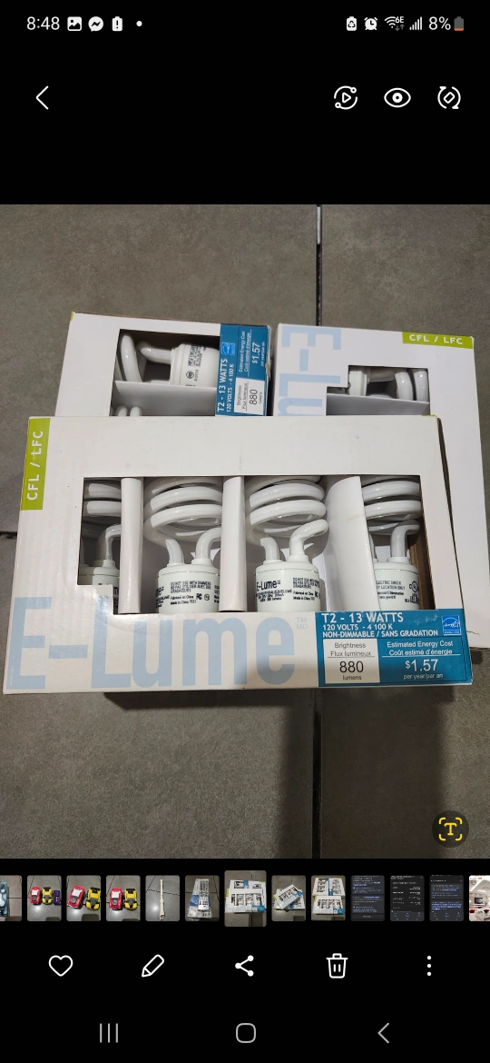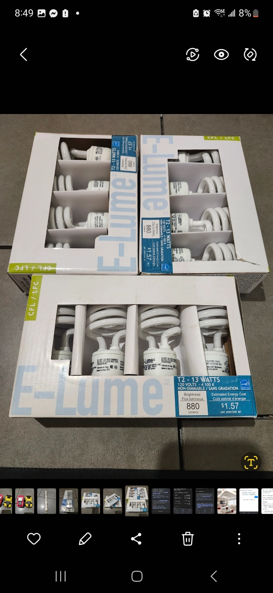 Selling two boxes of E-Lume CFL light bulbs. Each bulb uses 12-13 watts and emits 880 lumens. They are non-dimmable and cost $1.57 per year to operate. Perfect for energy-efficient lighting!selling for $10 each
